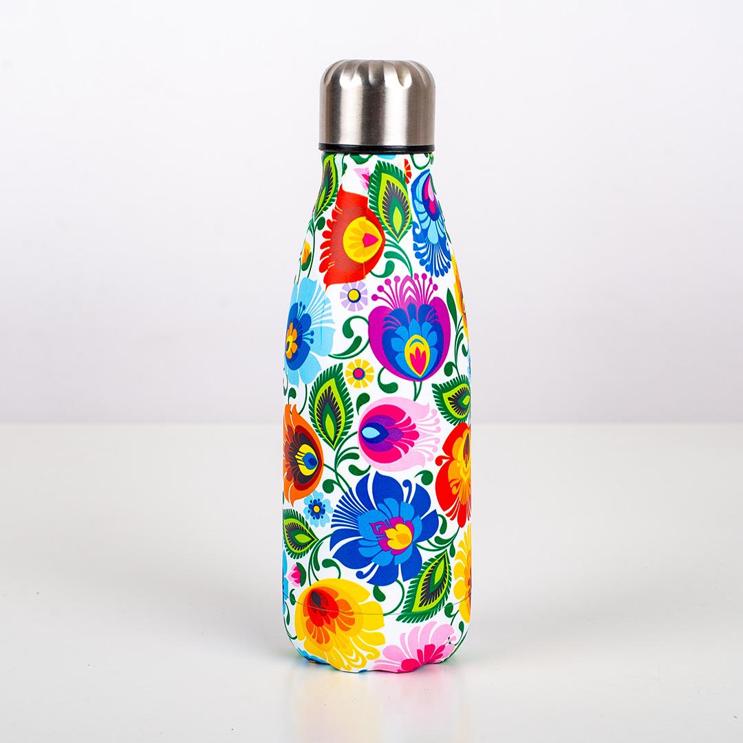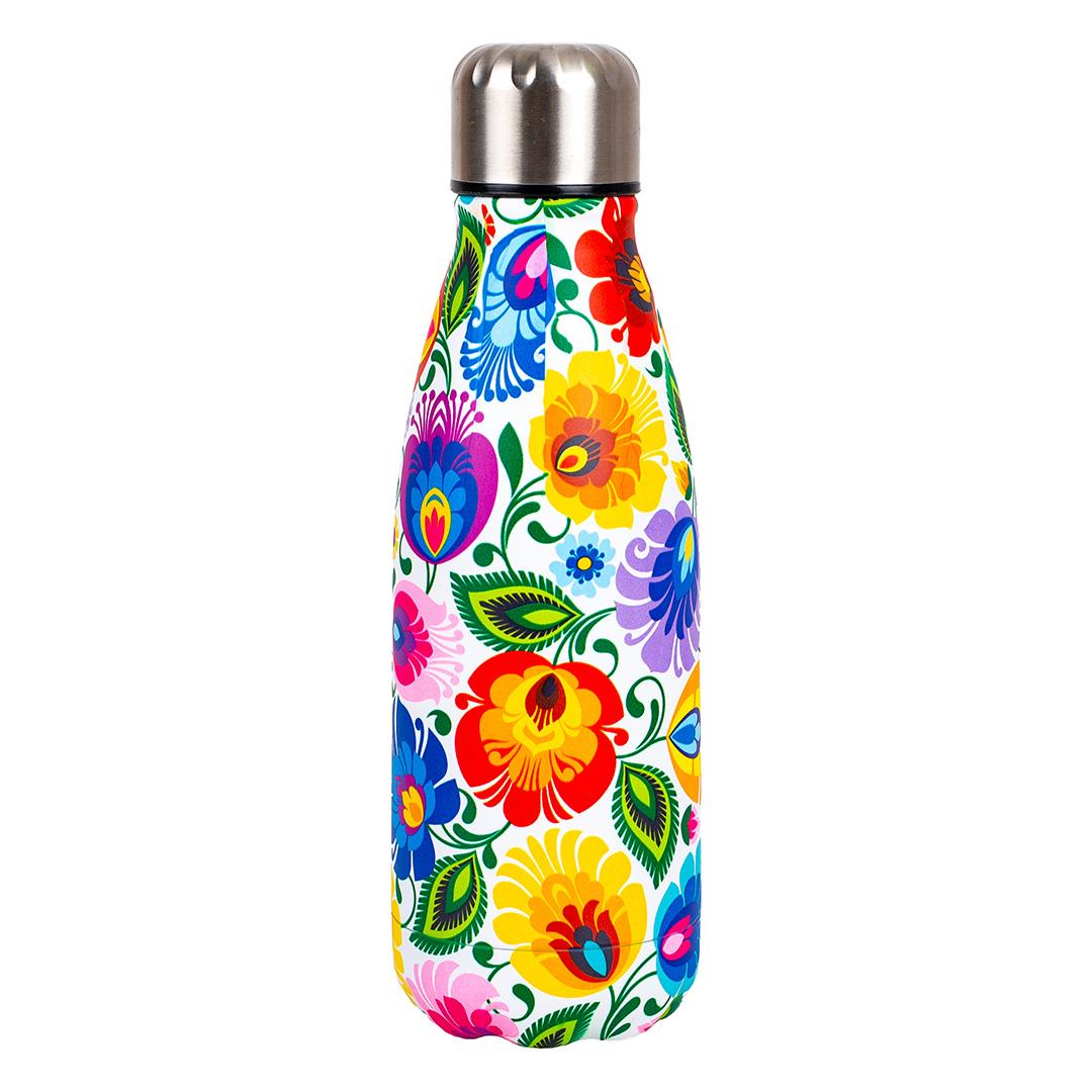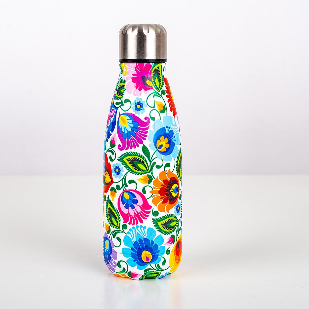 Biała butelka termiczna ozdobiona wzorami ludowymi inspirowanymi łowicką wycinanką (motywy kwiatowe).