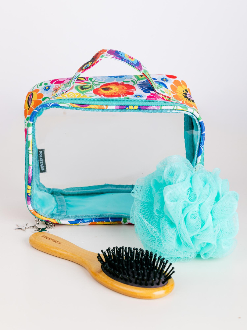 Pojemna kosmetyczka ozdobiona motywem kwiatowym z wycinanki łowickiej oraz jasnoniebieskim wykończeniem.