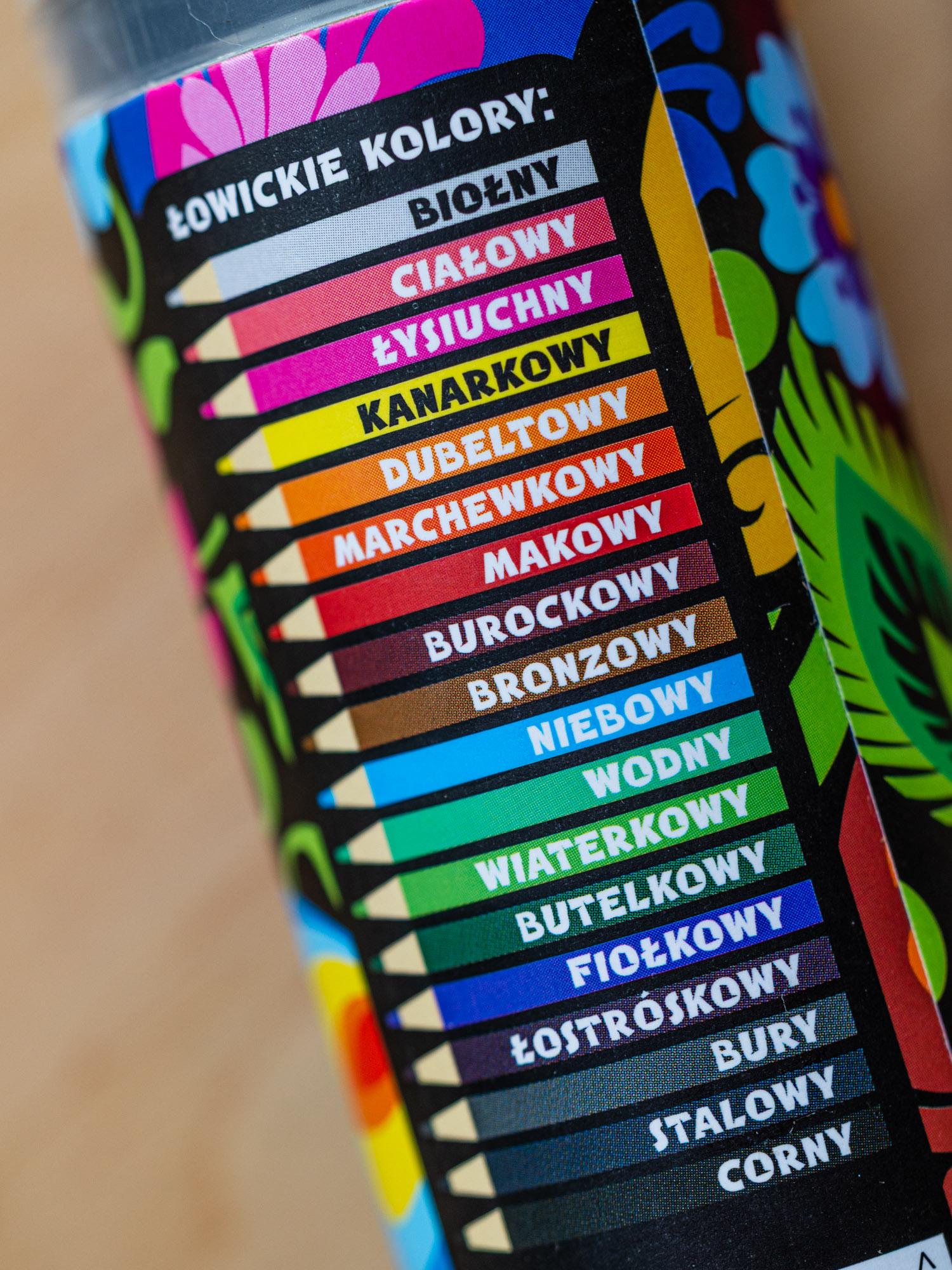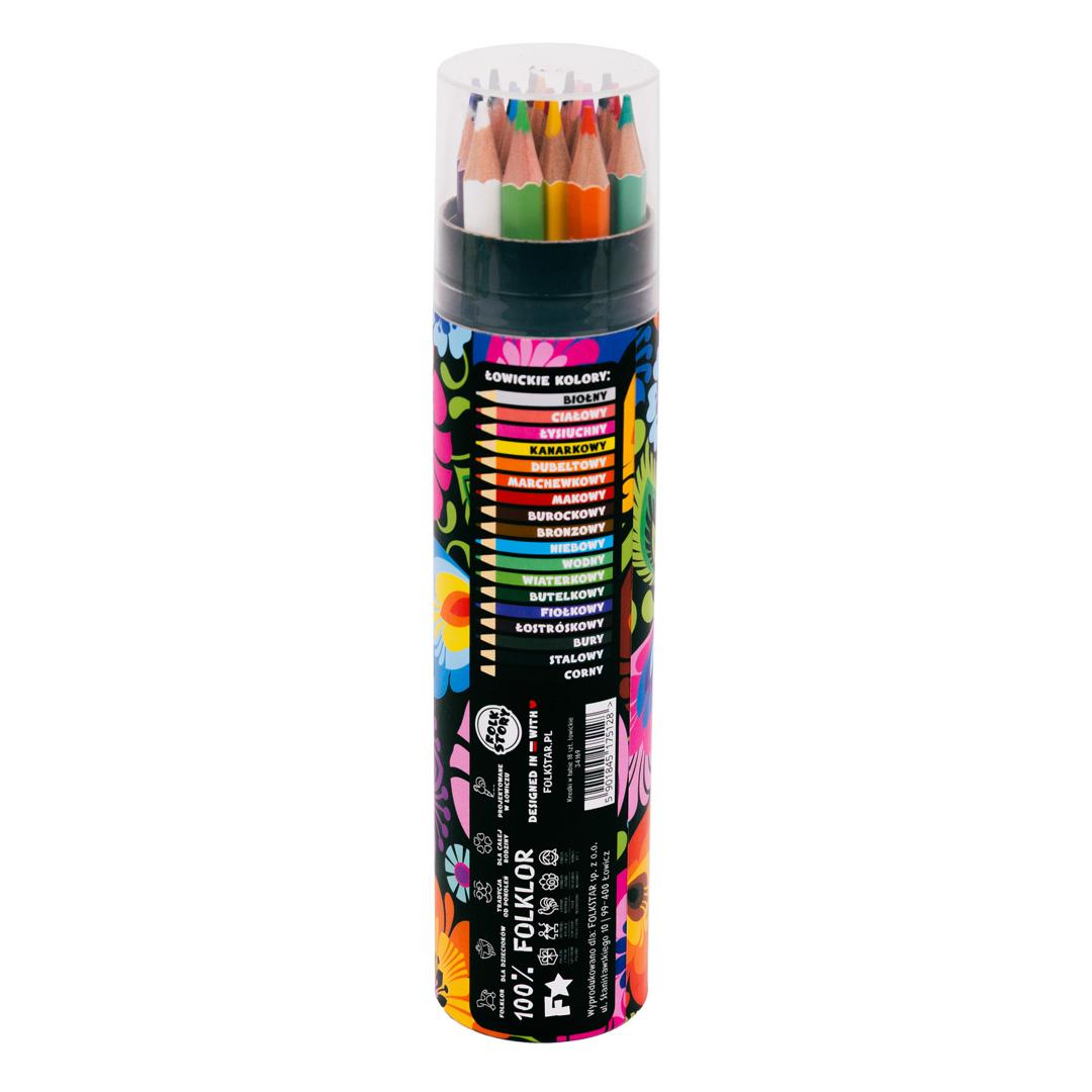 Zestaw 18 kolorowych kredek w tubie ozdobionej folkowymi wzorami łowickimi.