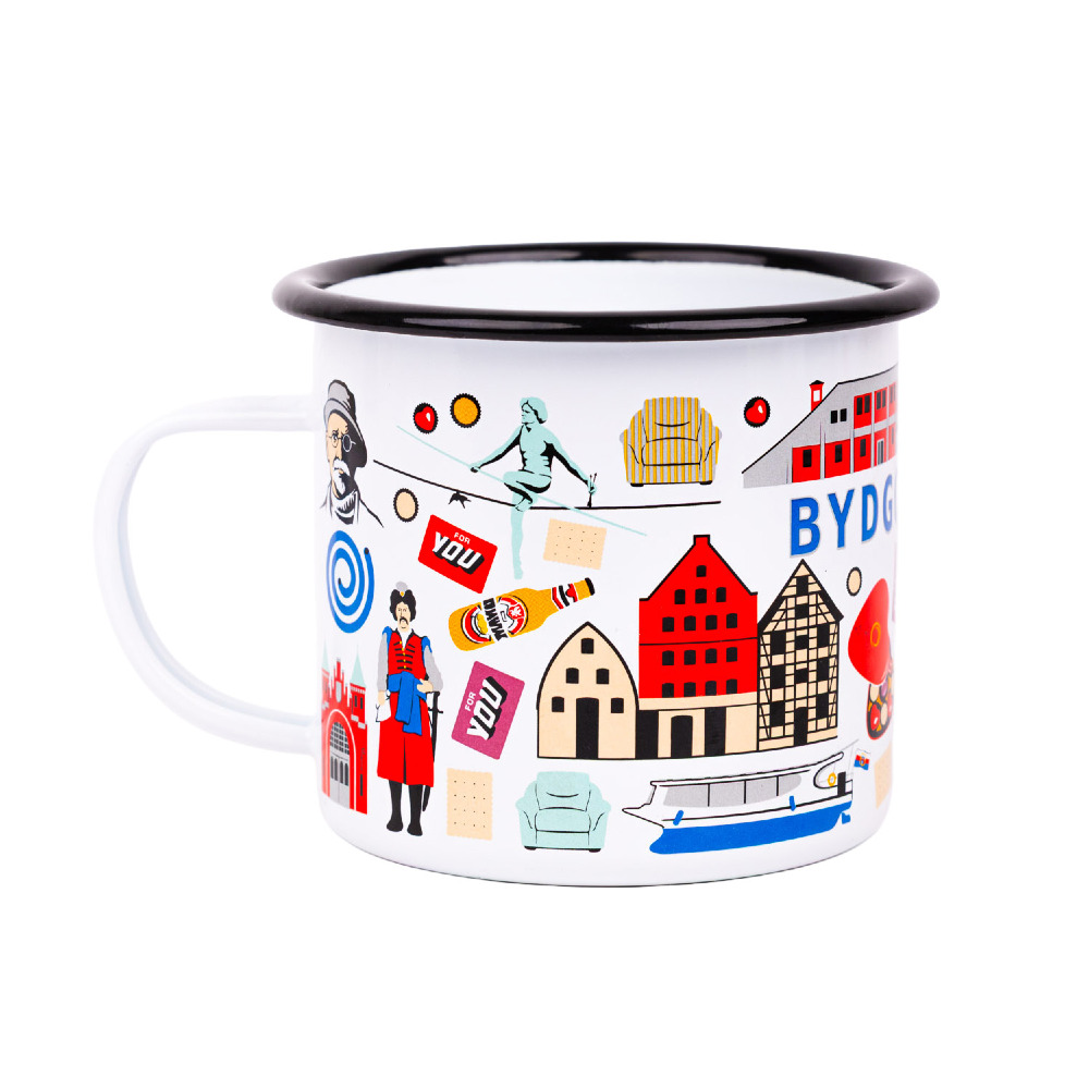 Metalowy, emaliowany o klasycznej pojemności 500 ml. Ozdobiony symbolami Bydgoszczy.