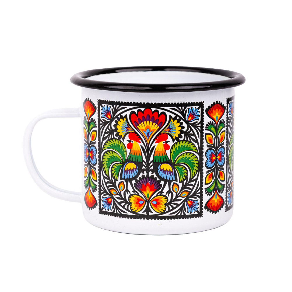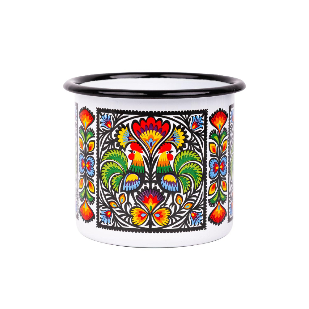 Metalowy, emaliowany o klasycznej pojemności 500 ml. Ozdobiony kolorowym wzorem przedstawiającym koguty z wycinanek łowickich.