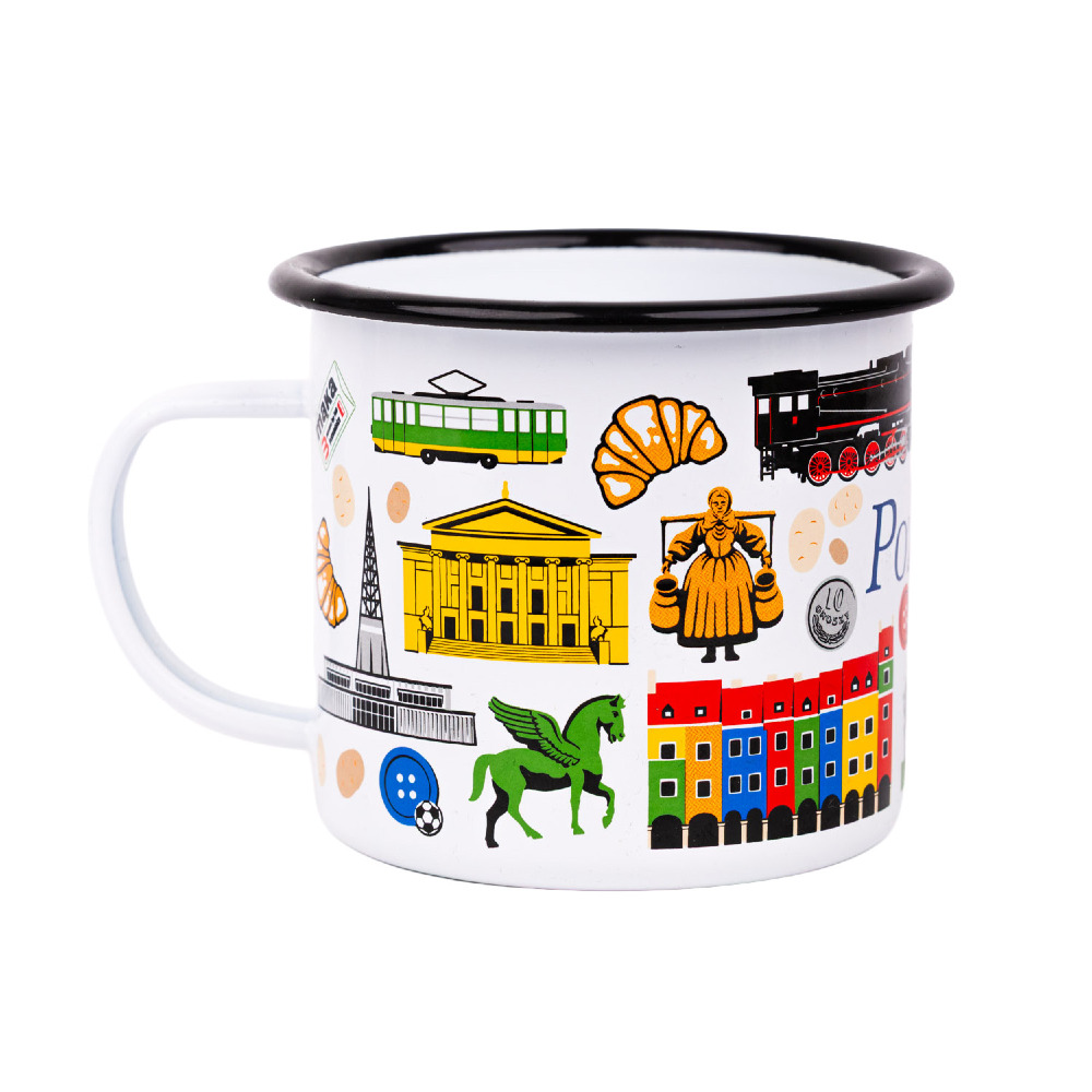 Metalowy, emaliowany o klasycznej pojemności 500 ml. Ozdobiony symbolami Poznania.