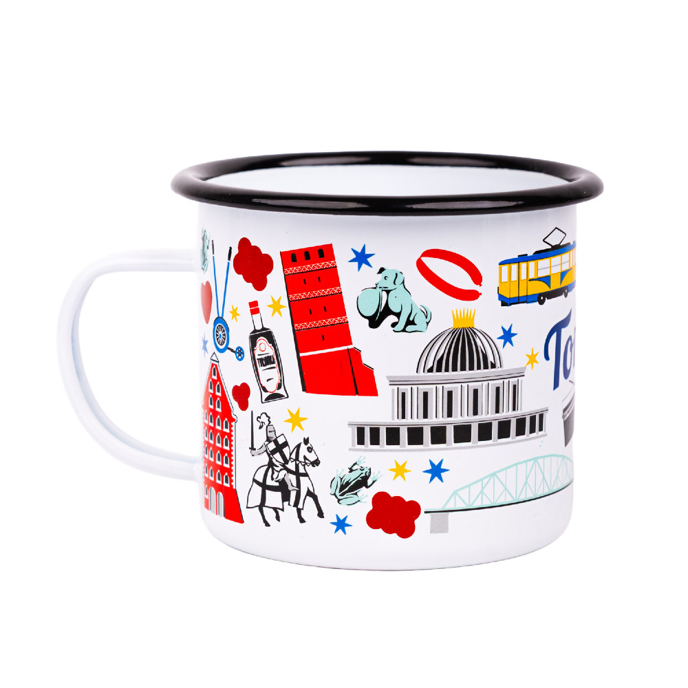 Metalowy, emaliowany o klasycznej pojemności 500 ml. Ozdobiony symbolami Torunia.