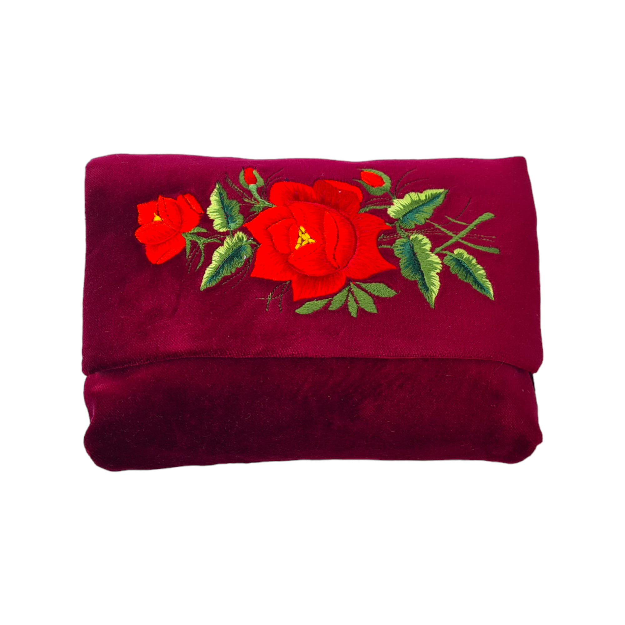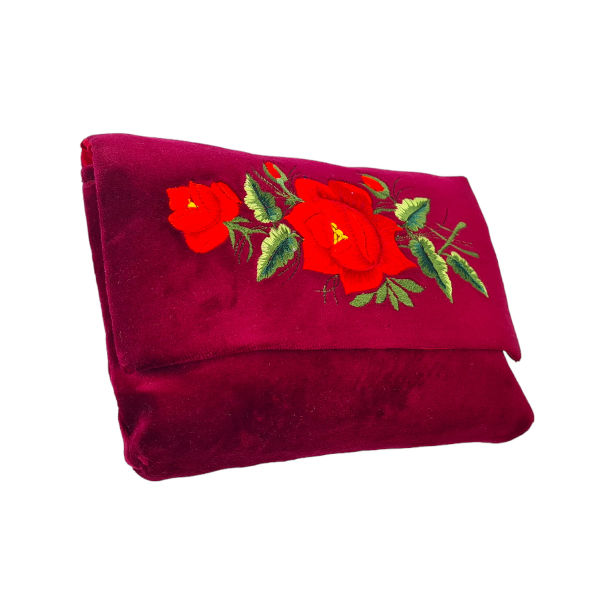 Zaprezentuj swój styl z nutą tradycji dzięki naszej bordowej kopertówce z haftem łowickim, ozdobionej dużą czerwoną różą. Ta ręcznie wykonana elegancka torebka z aksamitu łączy współczesny design z polską sztuką ludową, tworząc wyjątkowy dodatek, który wzbogaci każdą stylizację o subtelną nutę folkloru.