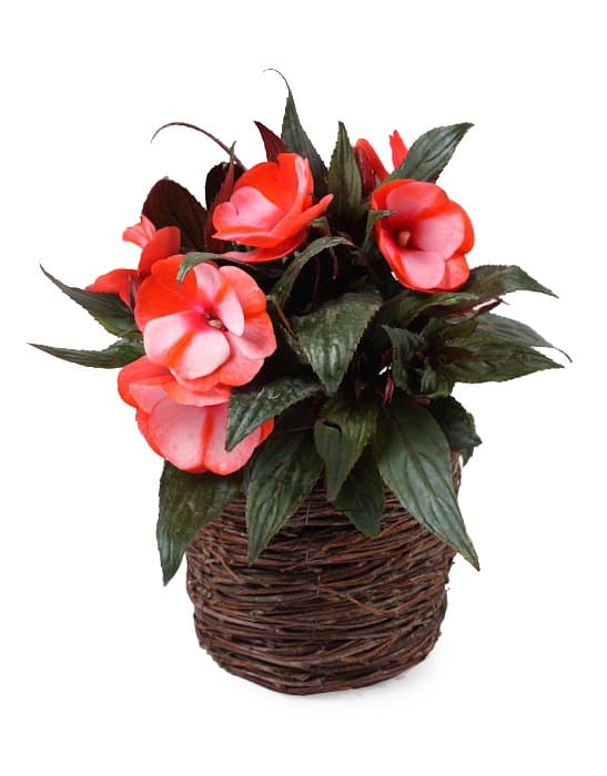 W koszyku ładnie prezentują się zarówno kolorowe kwiaty kwitnące, jak i rośliny zielone.