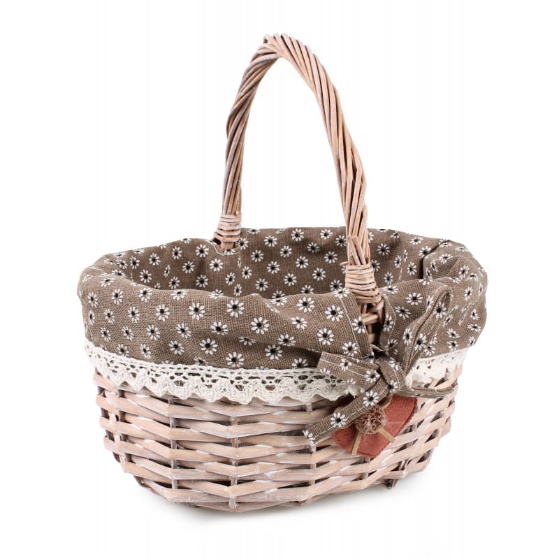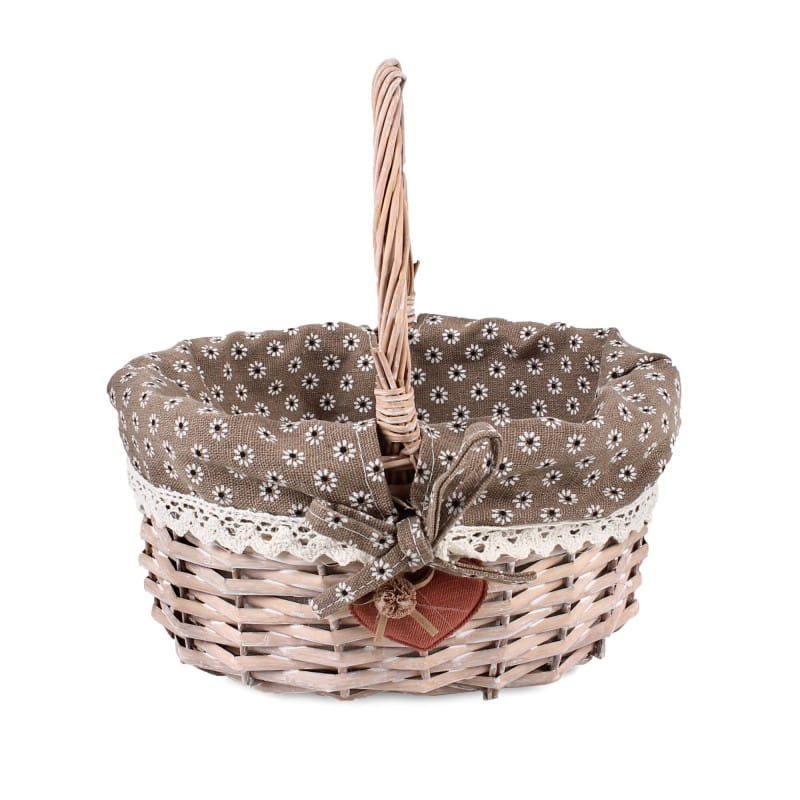 Brązowy kosz wiklinowy z materiałem jest bardzo dekoracyjny! Przetarcie białą farbą, wyściółka w drobne kwiatuszki obszyta bawełnianą koronką oraz urocza naszywka w kształcie serca - te wszystkie elementy idealnie ze sobą współgrają, tworzą spójną całość i - nie da się ukryć – nadają koszykowi rustykalnego charakteru.