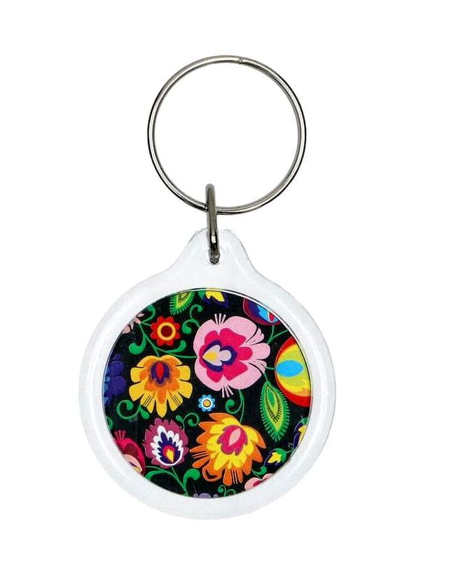 Czarny brelok do kluczy z wzorem inspirowanym wycinanką łowicką (kwiaty).