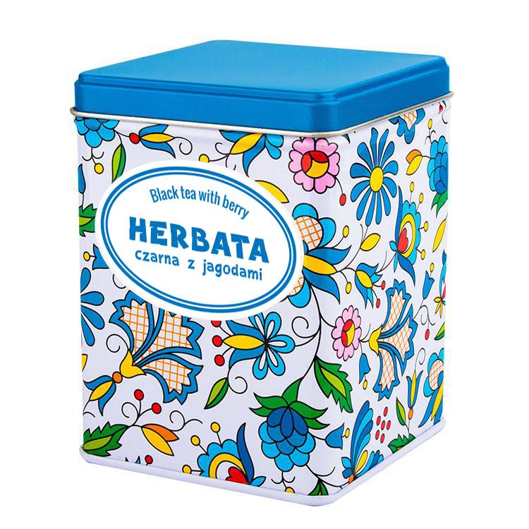 Zapakowana w elegancką metalową puszkę z kaszubskim wzorem kwiatowym na białym tle.