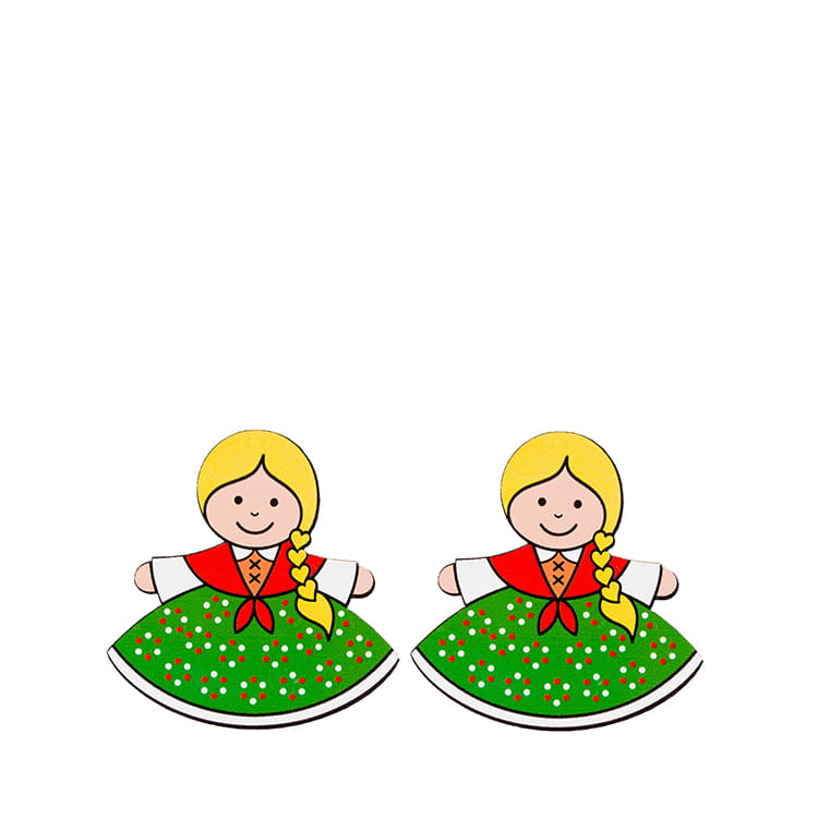 Kolorowe drewniane kolczyki wkręty. Na kolczykach przedstawione są stylizowane postacie Góralek w tradycyjnych strojach ludowych.