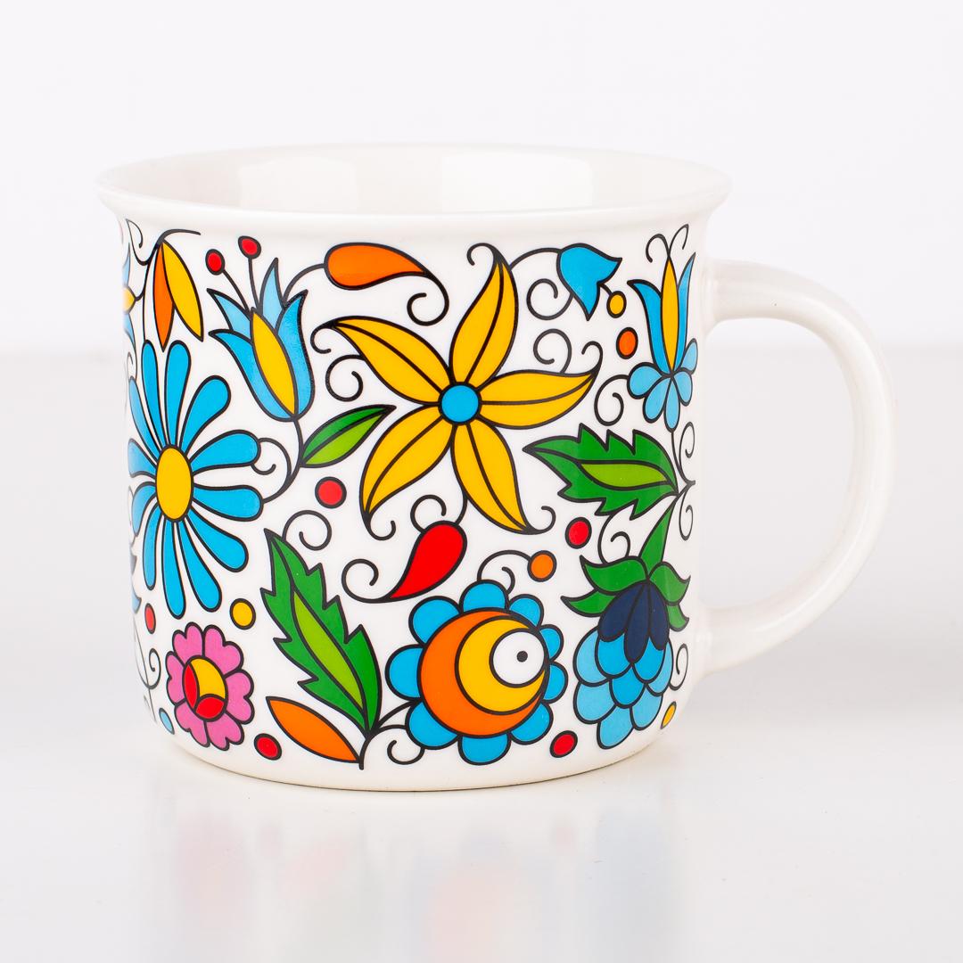 Pojemny kubek ozdobiony wzorami ludowymi inspirowanymi haftem kaszubskim.