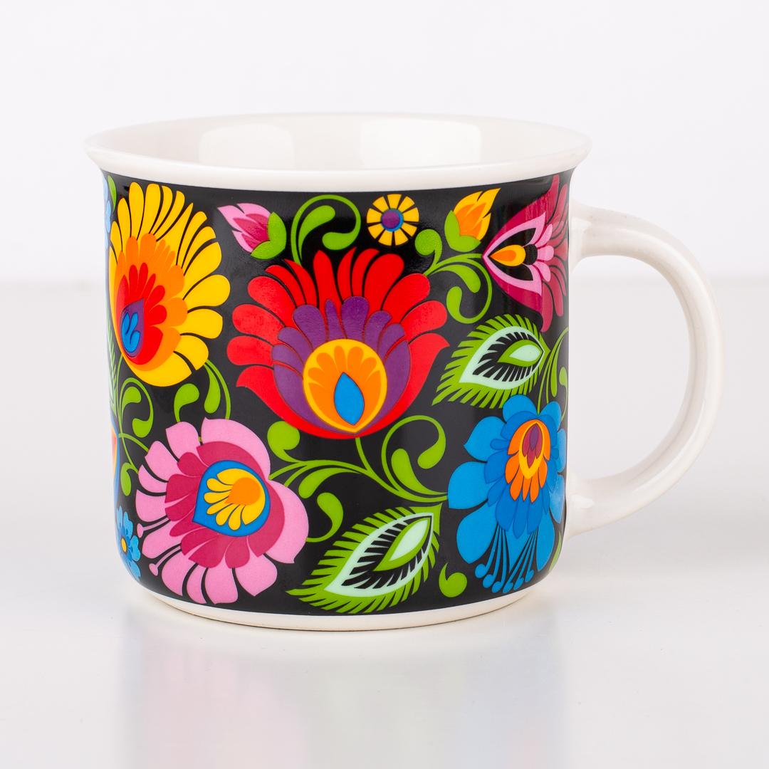 Pojemny kubek ozdobiony wzorami ludowymi inspirowanymi wycinanką łowicką.