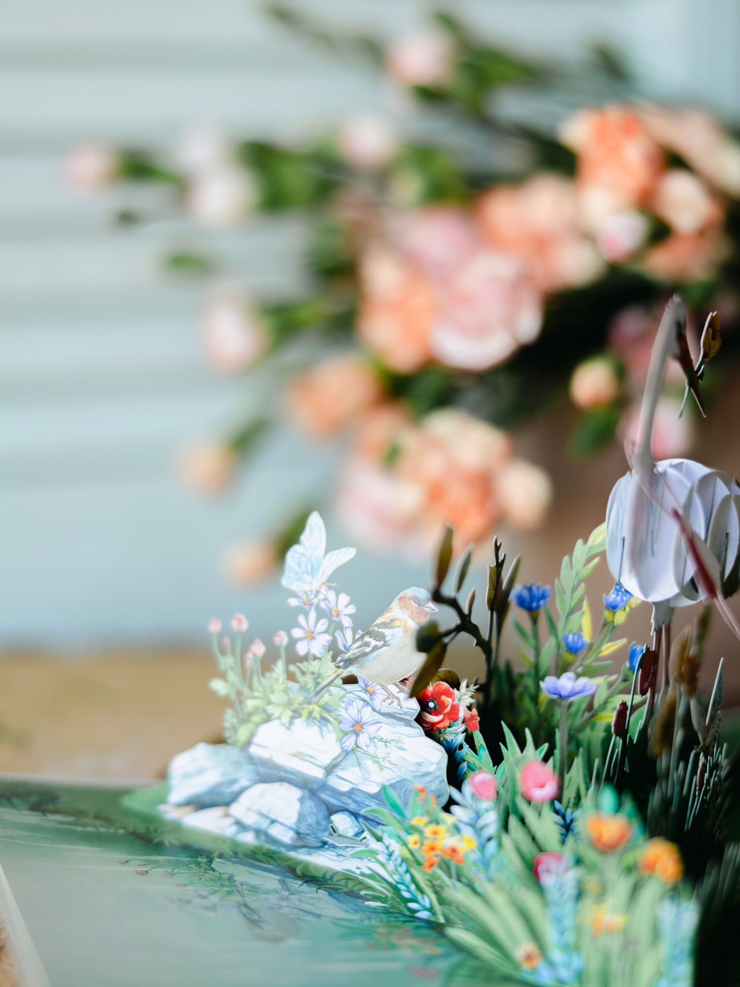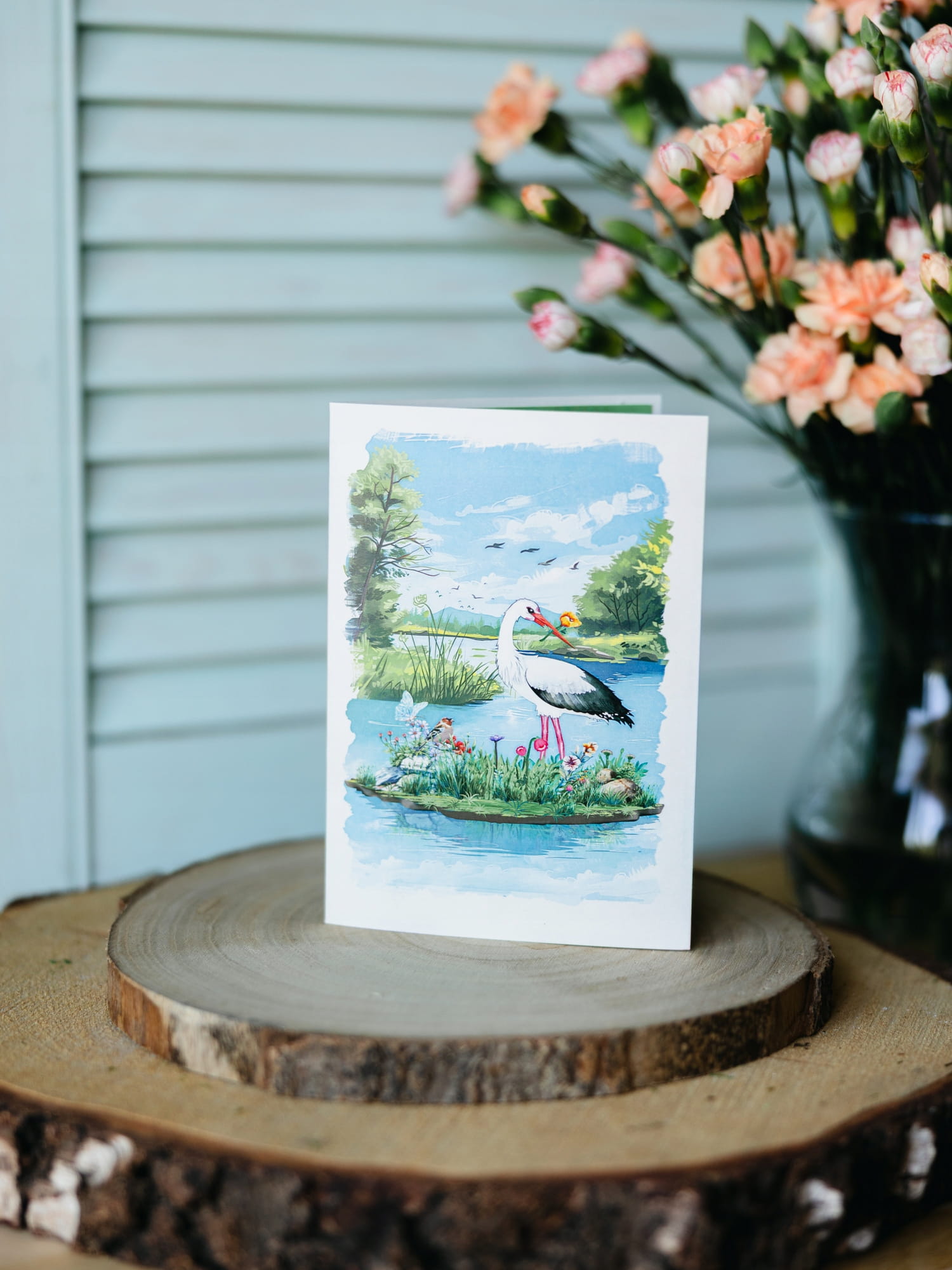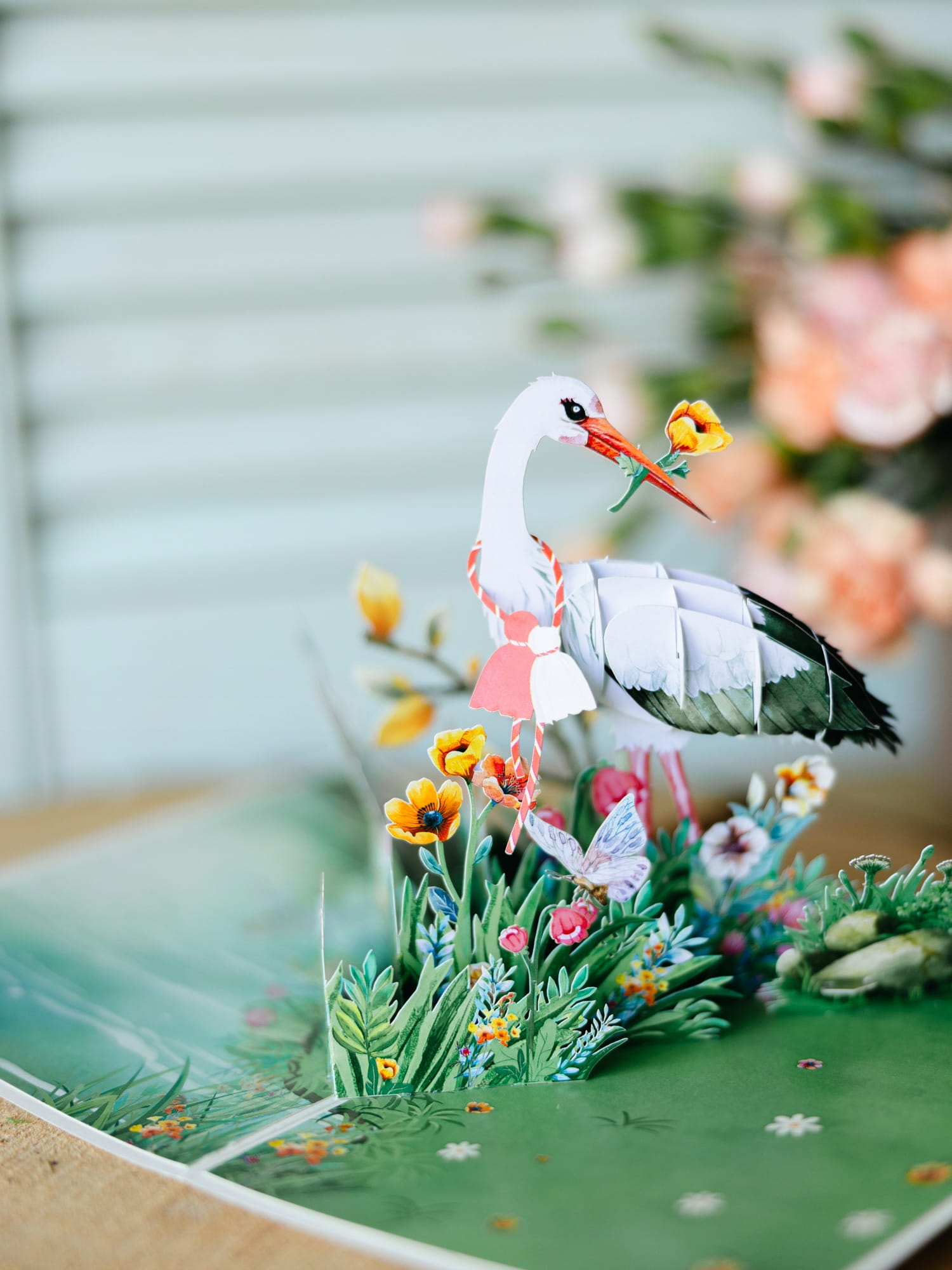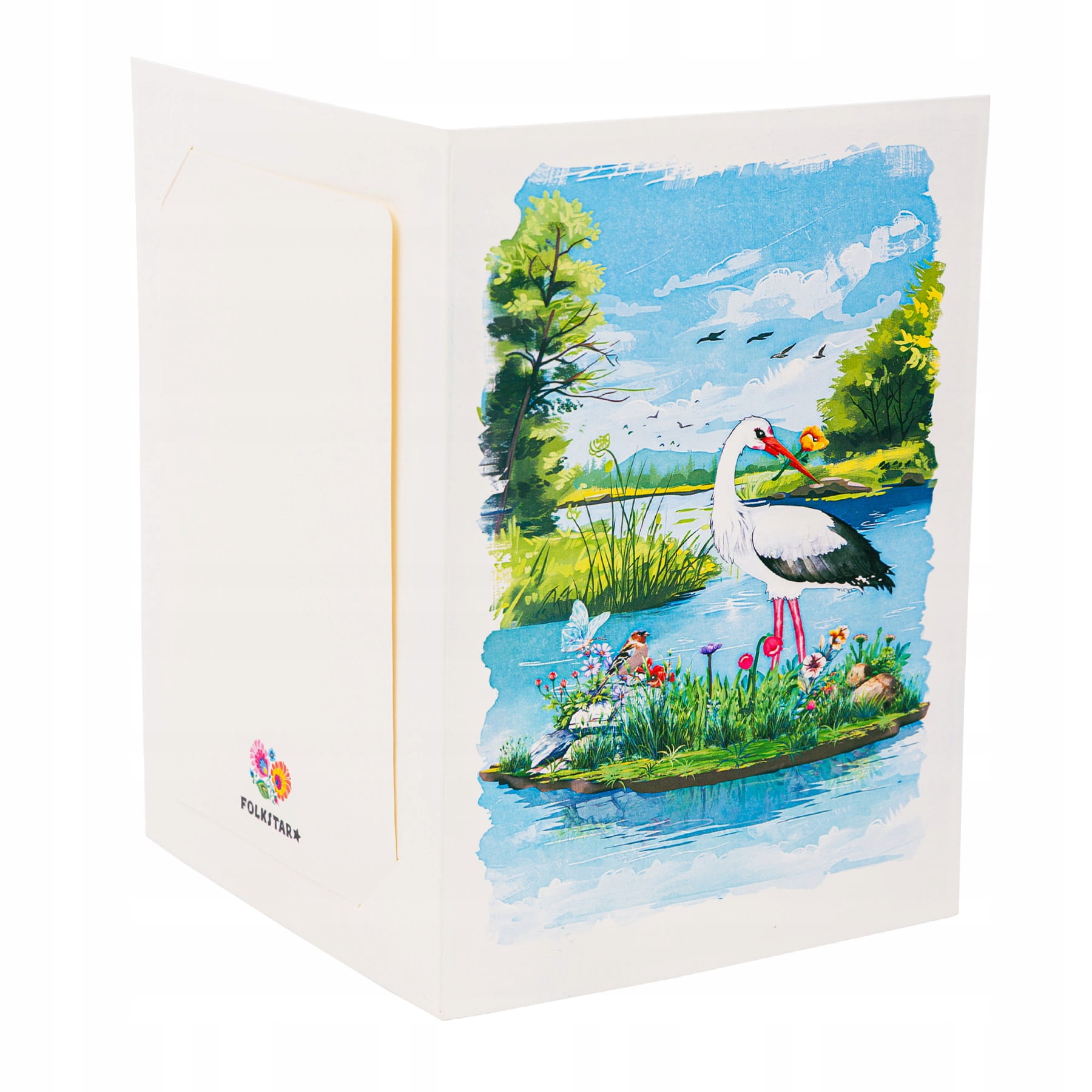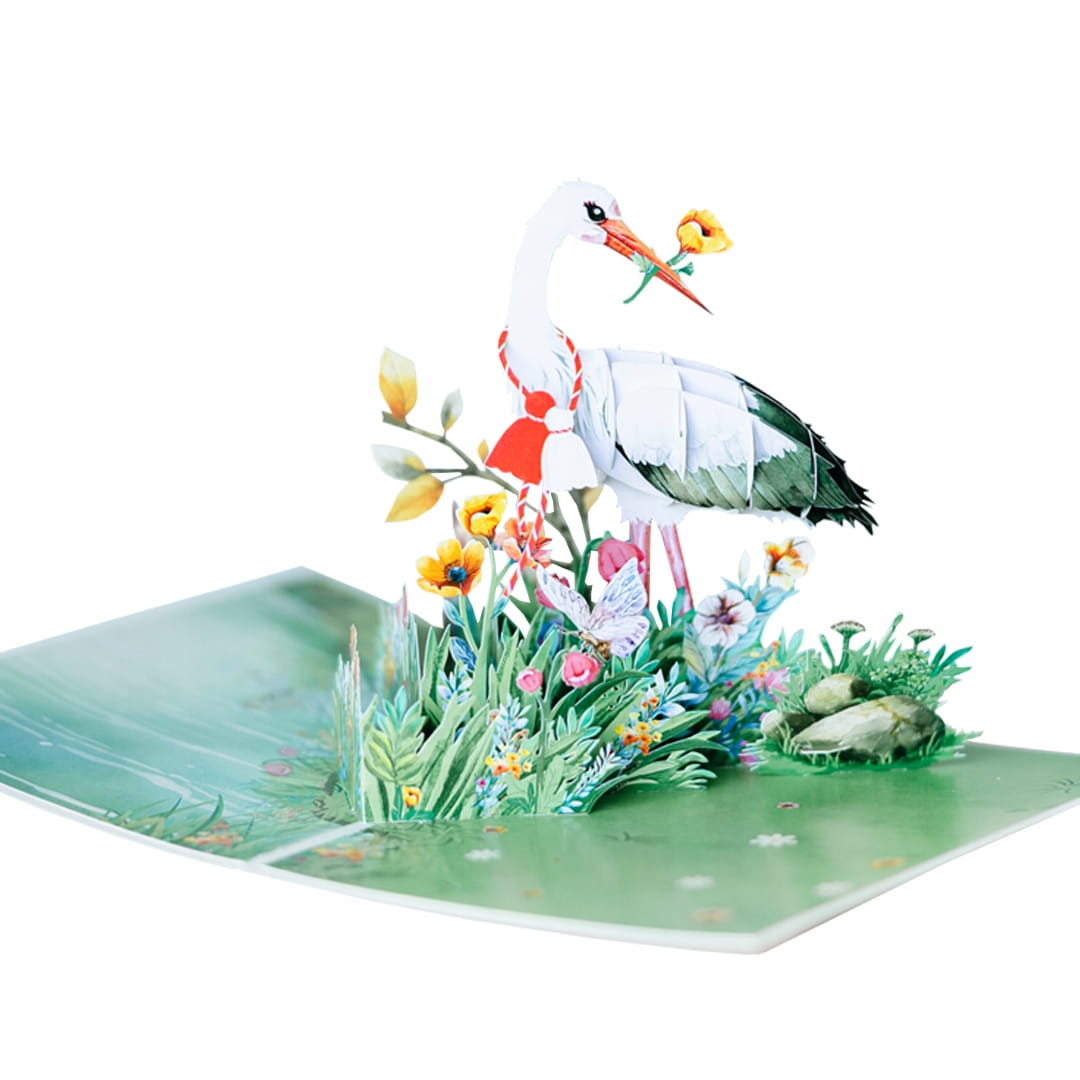 Kartka okolicznościowa 3D to elegancki dodatek na różne okazje. Po otwarciu kartki ukazuje się trójwymiarowa kompozycja przedstawiająca bociana na łące kwietnej.