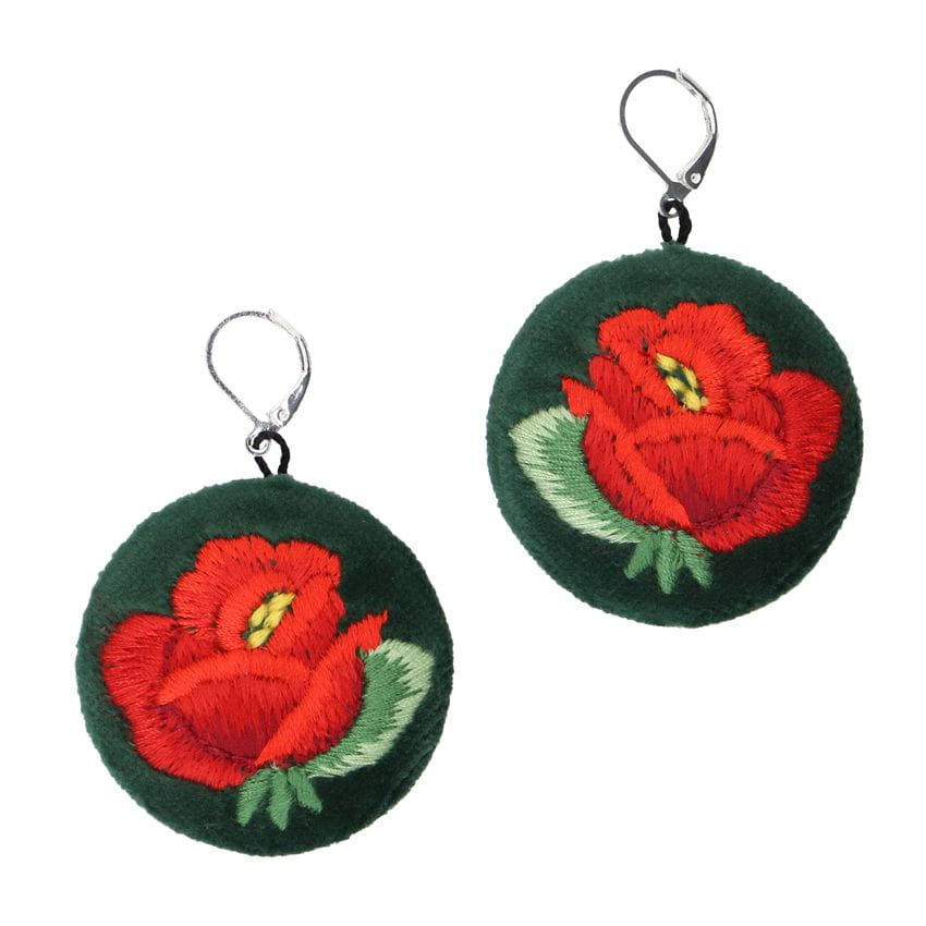 Kolczyki Folk - Haft łowicki - Czerwona róża - Zielone