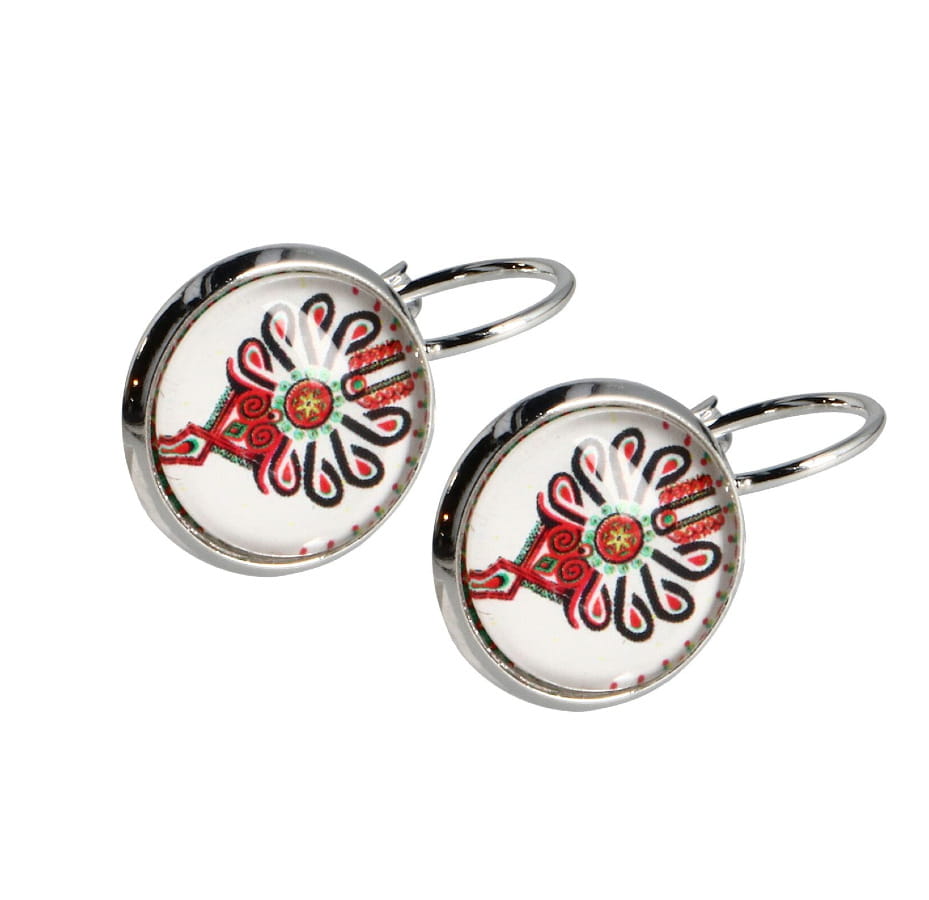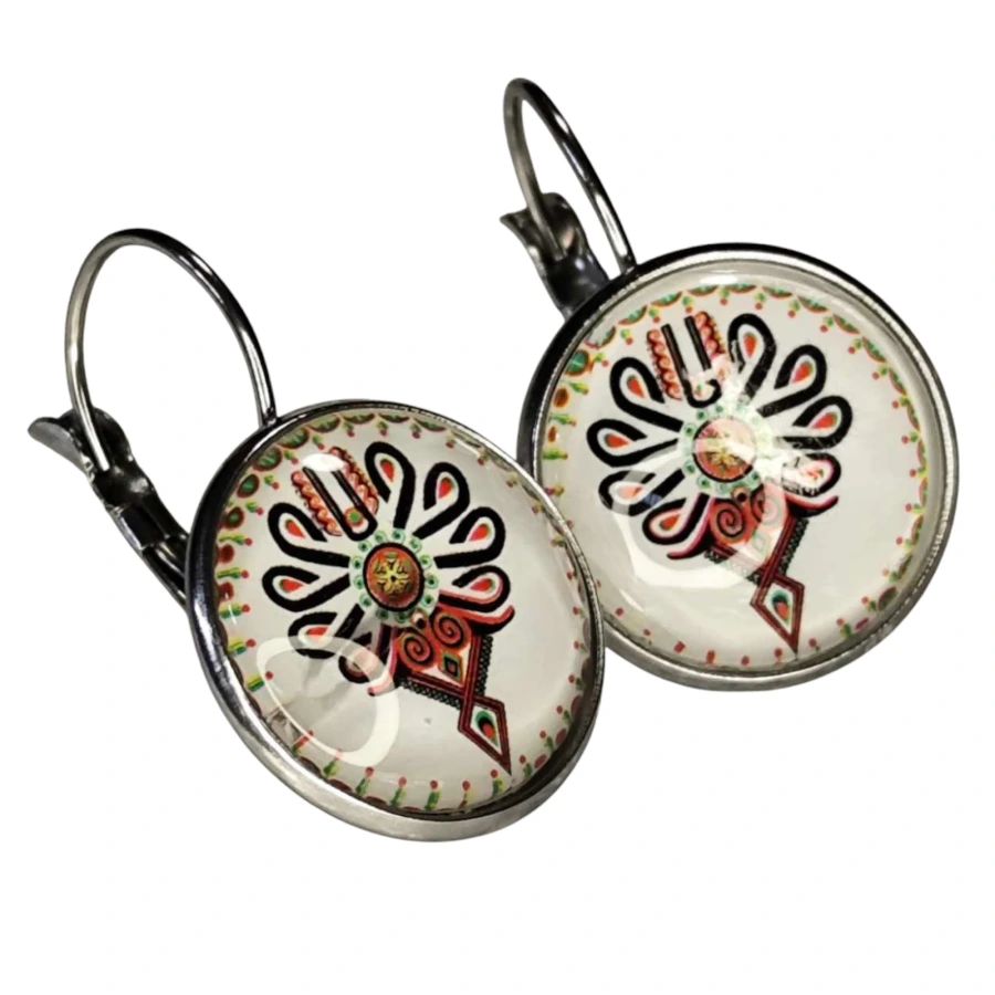 Wzór dekoracyjny znajduje się w przezroczystej, wypukłej soczewce ze szkła. Kolczyki osadzone są na klasycznych biglach w kolorze srebrnym z zapięciem typu angielskiego.