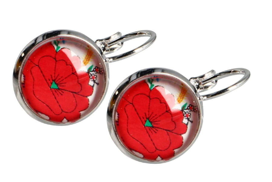 Wzór dekoracyjny znajduje się w przezroczystej, wypukłej soczewce ze szkła. Kolczyki osadzone są na klasycznych biglach w kolorze srebrnym z zapięciem typu angielskiego.