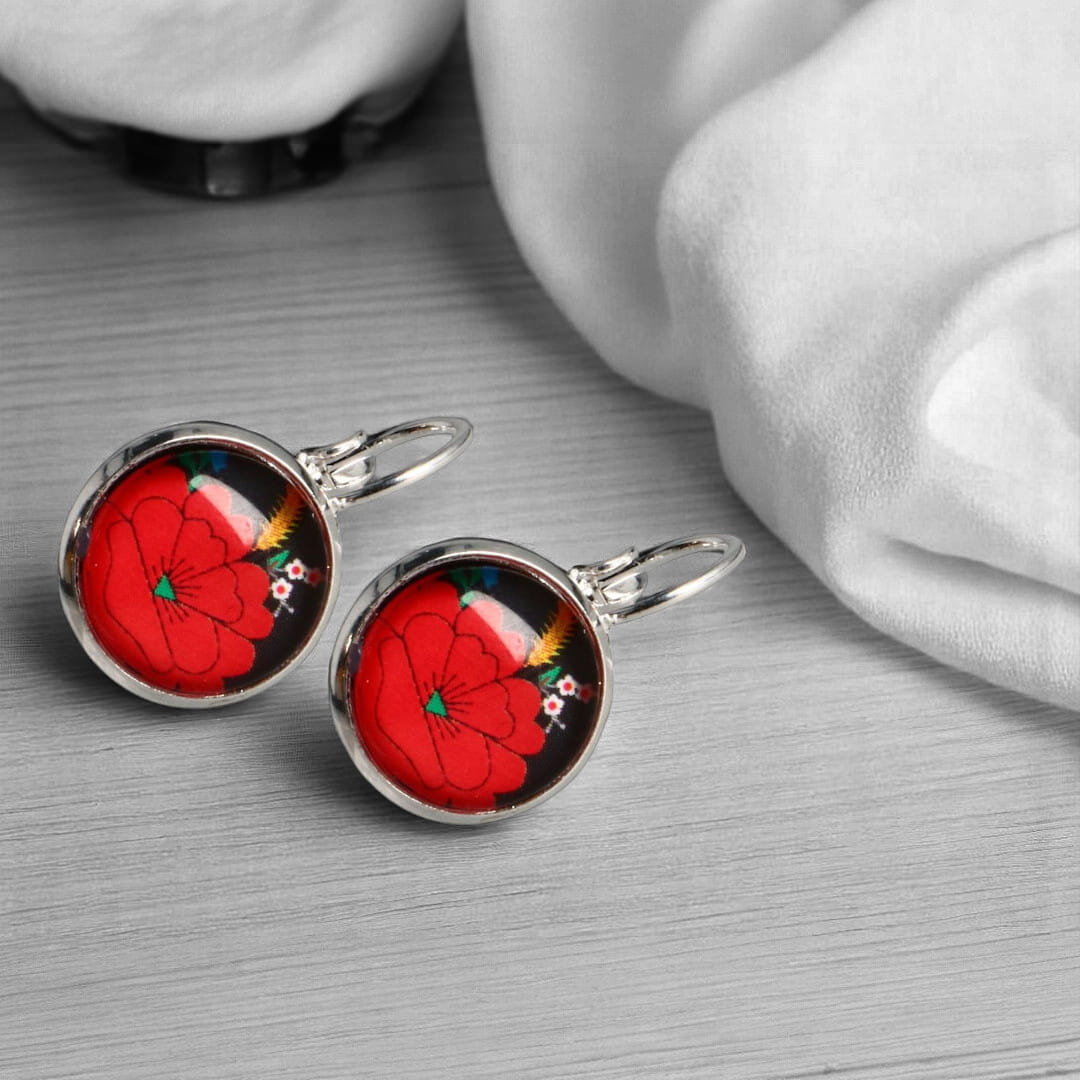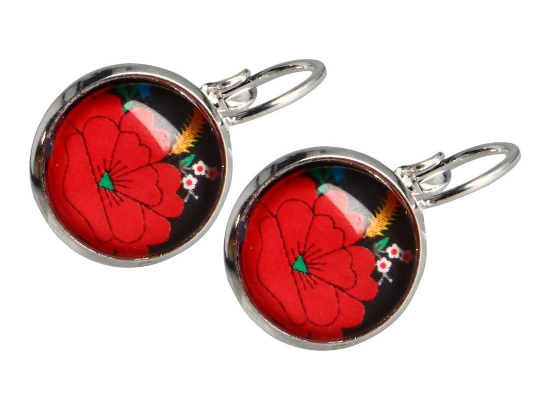 Wzór dekoracyjny znajduje się w przezroczystej, wypukłej soczewce ze szkła. Kolczyki osadzone są na klasycznych biglach w kolorze srebrnym z zapięciem typu angielskiego.