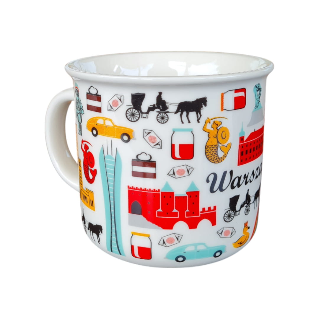 Wzór dekoracyjny znajduje się na brzegach kubka i przedstawia symbole miasta stołecznego Warszawy