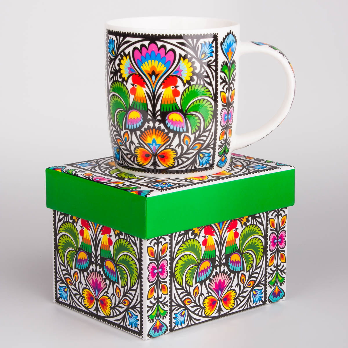Kubek w pudełku Folk 360 ml - Wzory łowickie - Koguty