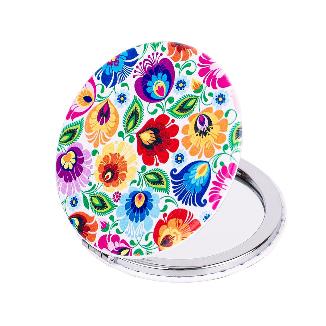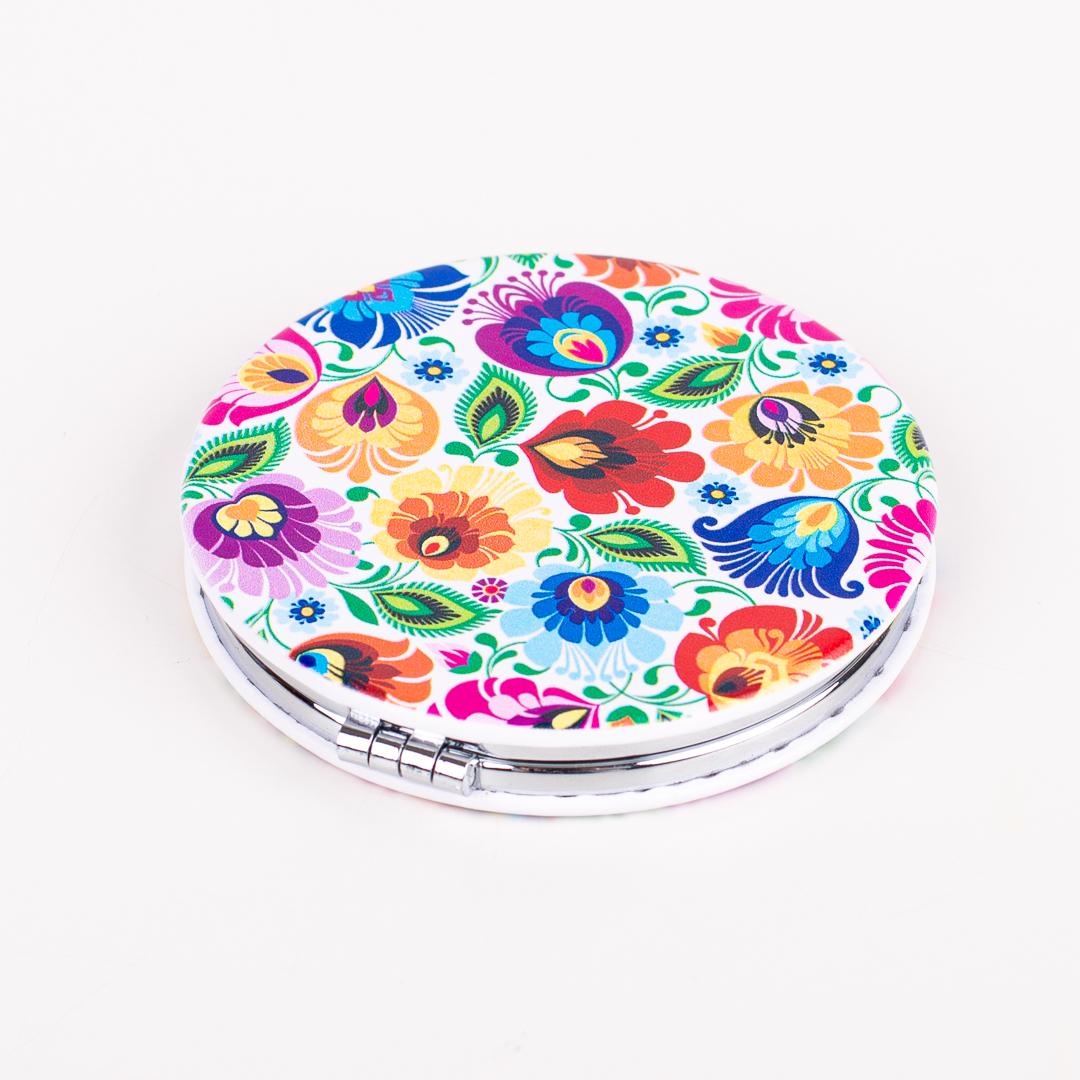 Folkowe lusterko do torebki z wzorem inspirowanym wycinanką łowicką.