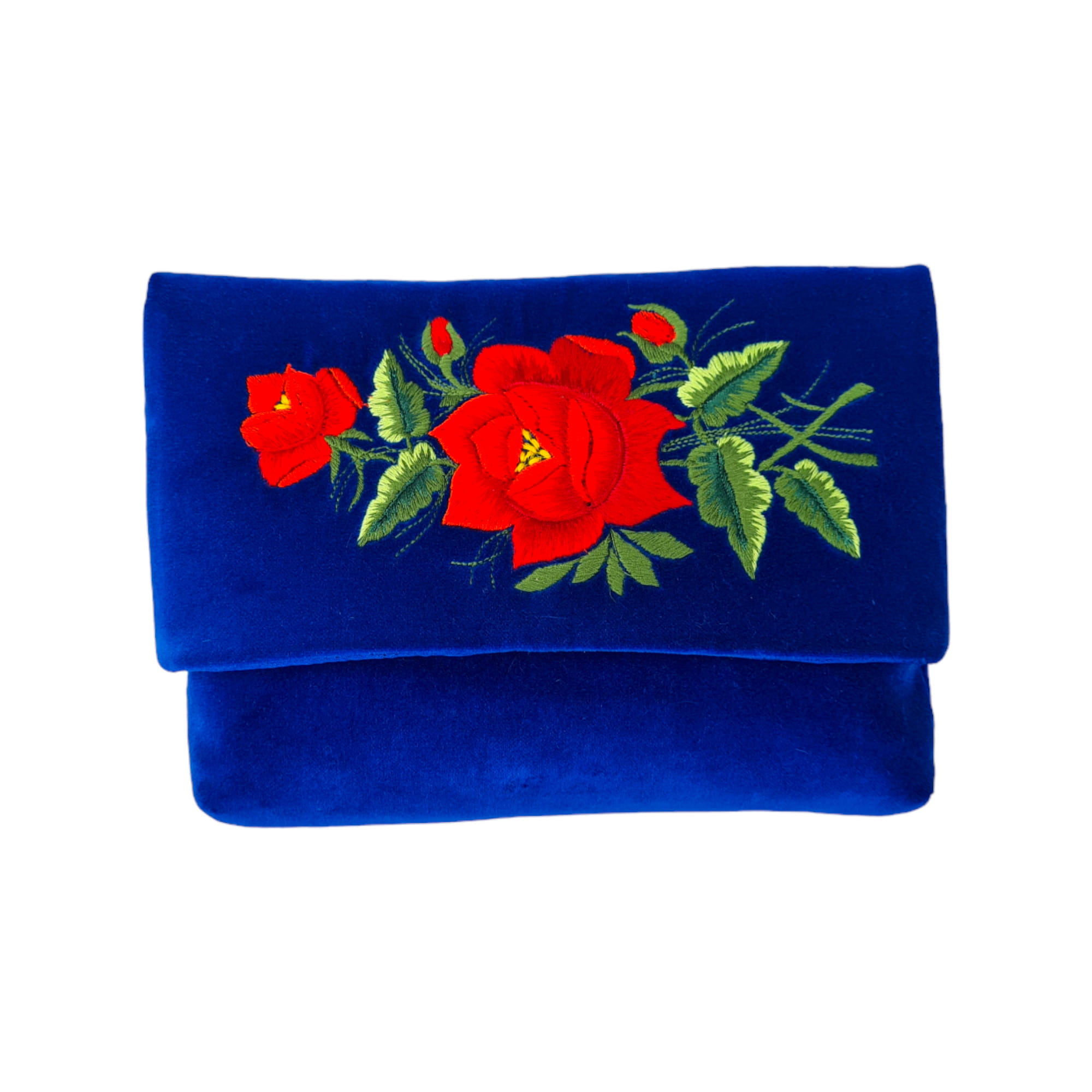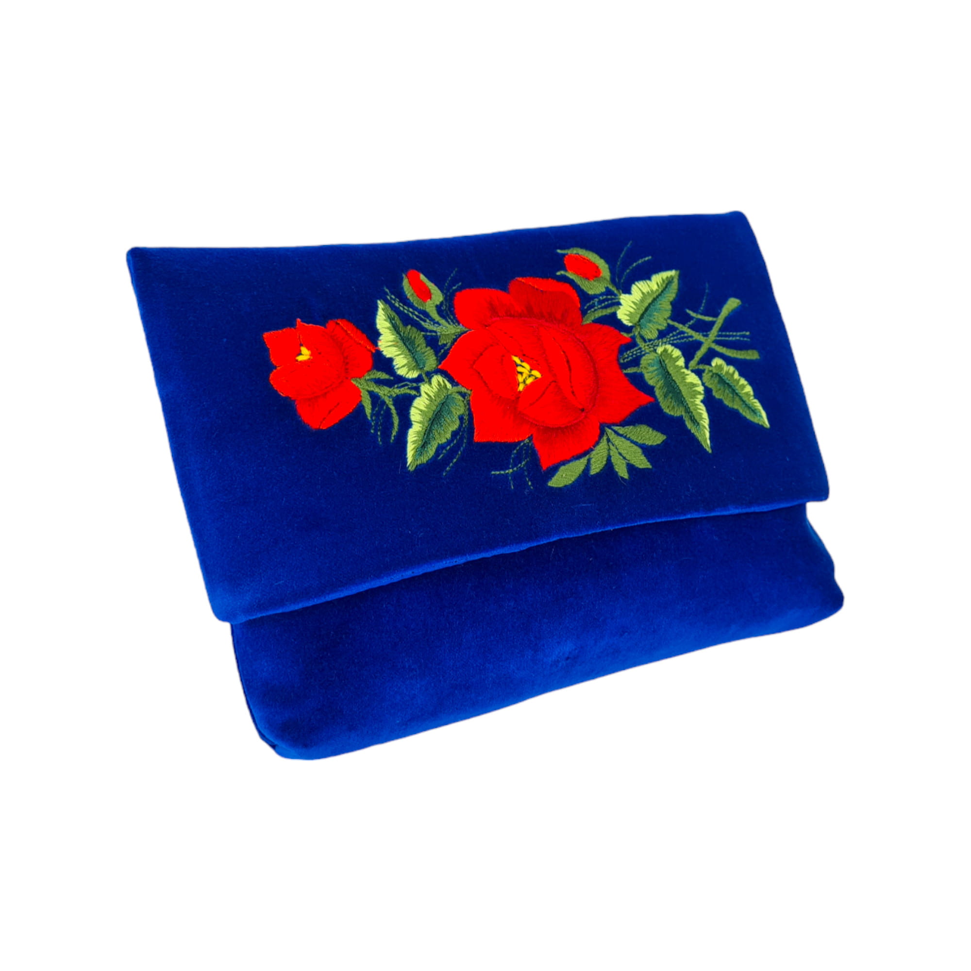 Zaprezentuj swój styl z nutą tradycji dzięki naszej niebieskiej kopertówce z haftem łowickim, ozdobionej dużą czerwoną różą. Ta ręcznie wykonana elegancka torebka z aksamitu łączy współczesny design z polską sztuką ludową, tworząc wyjątkowy dodatek, który wzbogaci każdą stylizację o subtelną nutę folkloru.