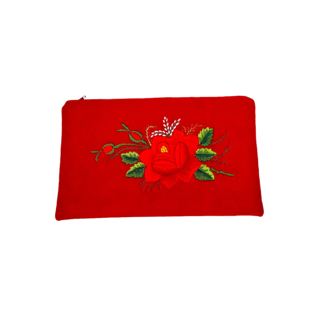 Czerwona płaska kosmetyczka ozdobiona haftem łowickim przedstawiającym łowicką różę.