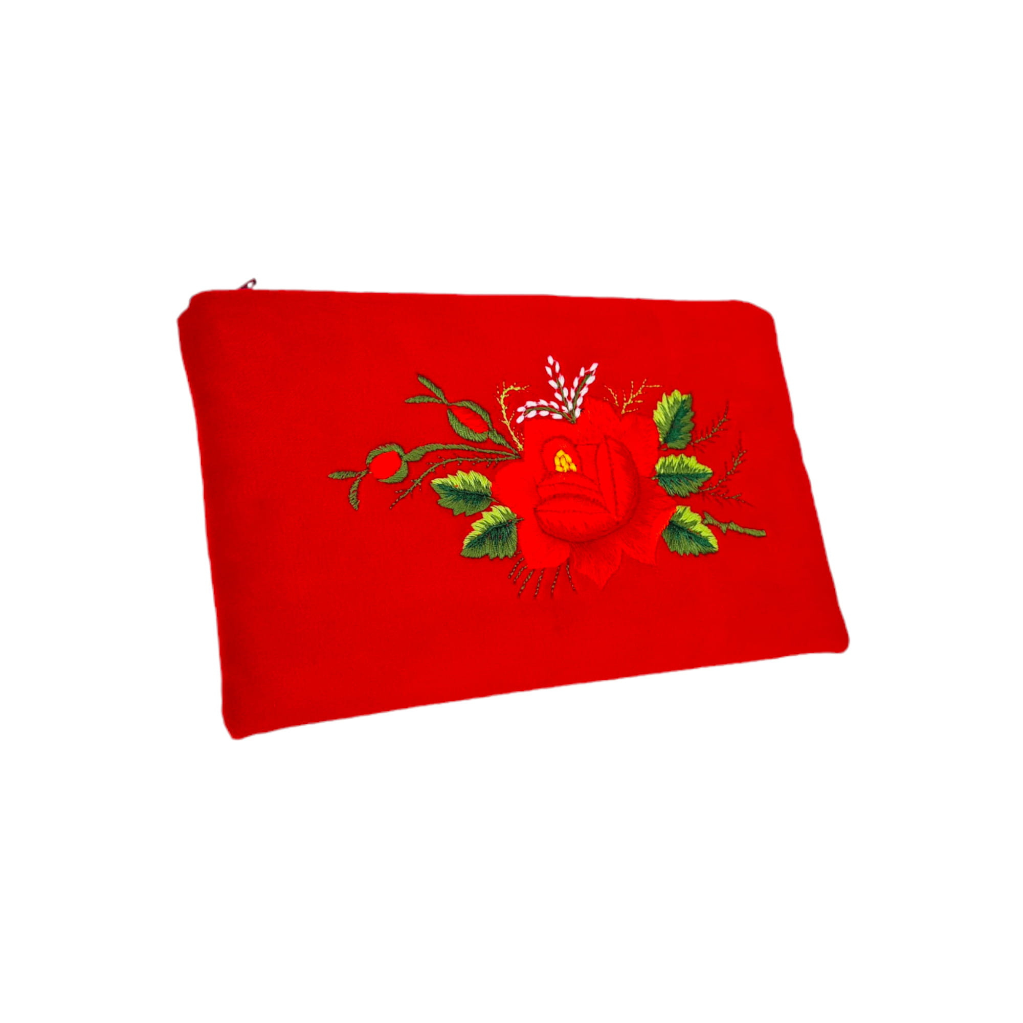 Kosmetyczka została ręcznie wykonana z eleganckiego aksamitu w kolorze czerwonym. Piękny haft przedstawiający łowicką różę został wykonany techniką ręczno-maszynową. Płaska kosmetyczka z haftem to idealny wybór na przechowywanie niezbędnych kosmetyków, akcesoriów do makijażu lub innych drobiazgów.