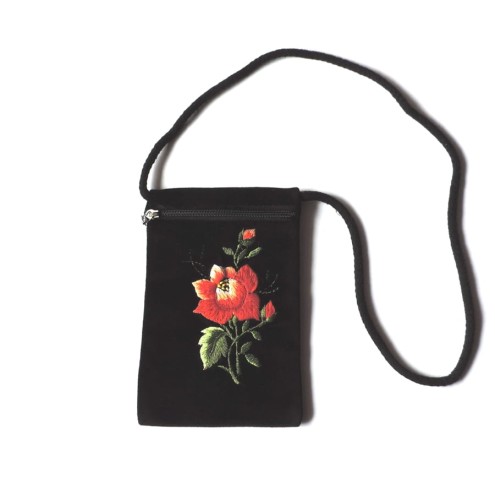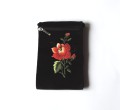 Paszportówka z czarnego aksamitu ozdobiona haftem łowickim z czerwoną różą.