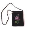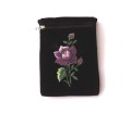 Paszportówka z aksamitu ozdobiona haftem łowickim z fioletową różą - tradycyjnym ludowym motywem zdobniczym.