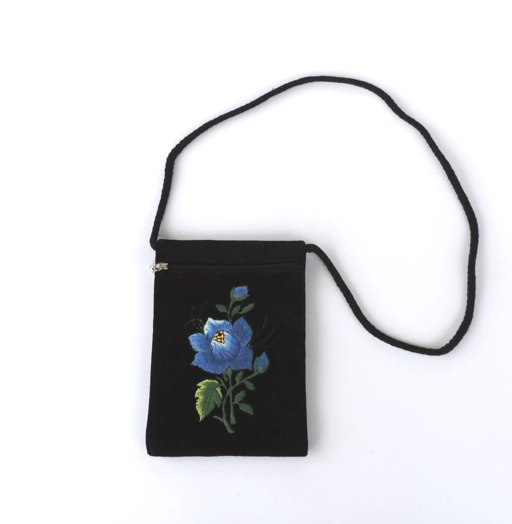Paszportówka z czarnego aksamitu ozdobiona haftem łowickim z niebieską różą - tradycyjnym ludowym motywem zdobniczym.