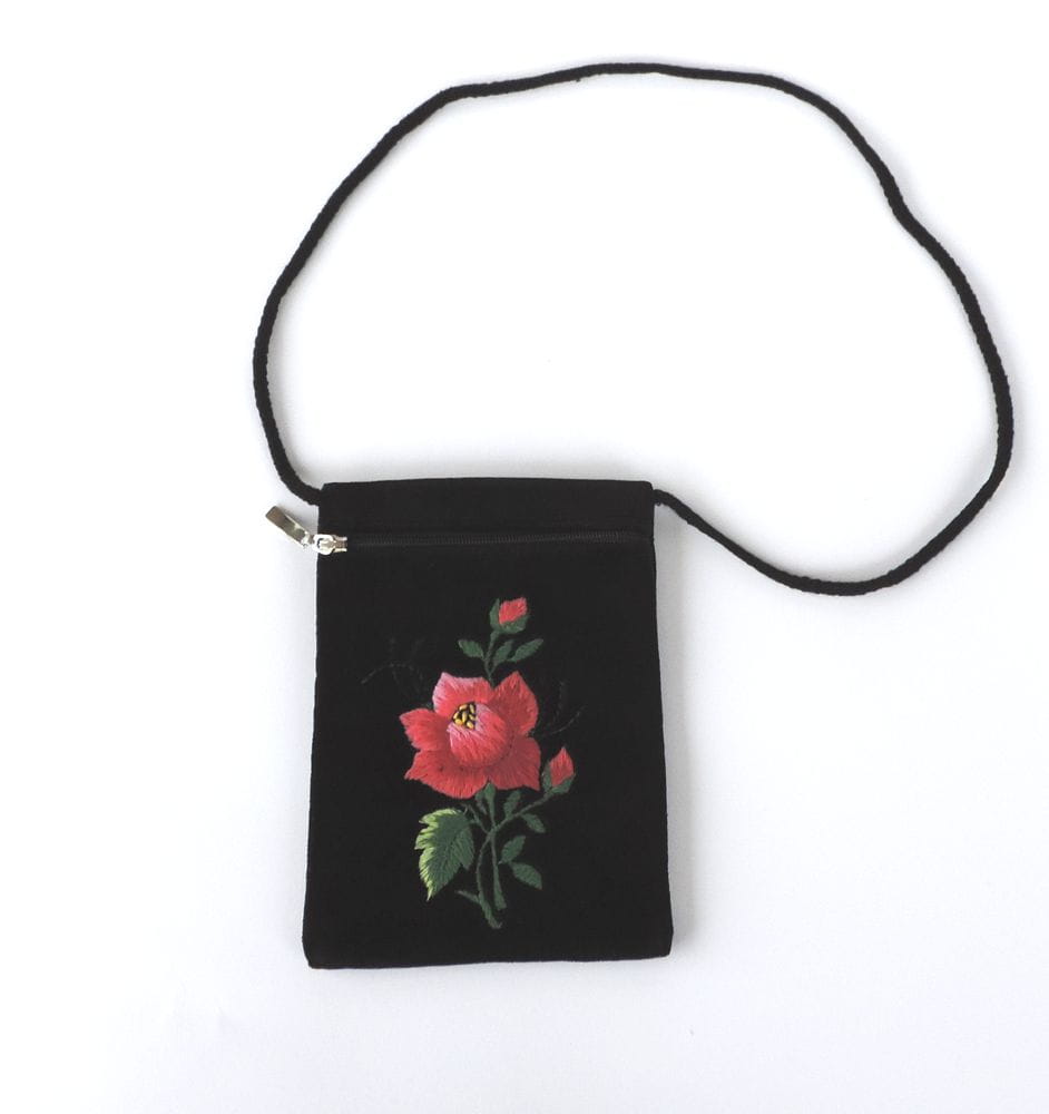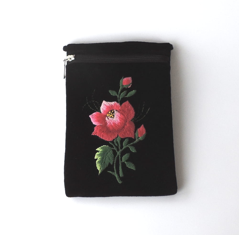 Paszportówka z czarnego aksamitu ozdobiona haftem łowickim z różową różą - tradycyjnym ludowym motywem zdobniczym.