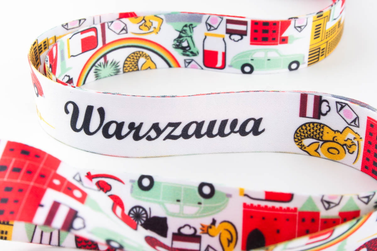 Biała szeroka smycz do telefonu/kluczy z napisem Warszawa wzorami przedstawiającym symbole miasta Warszawy.