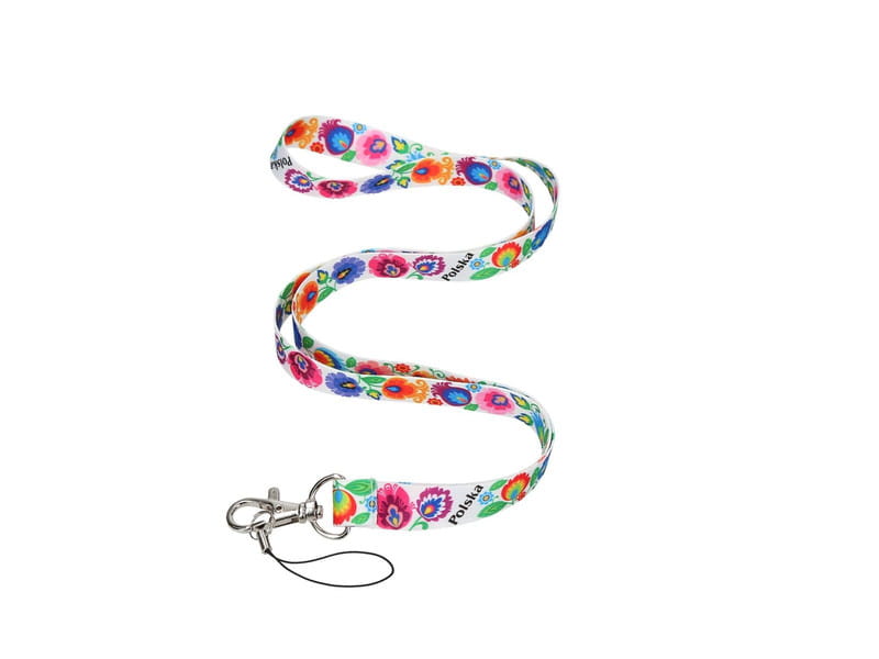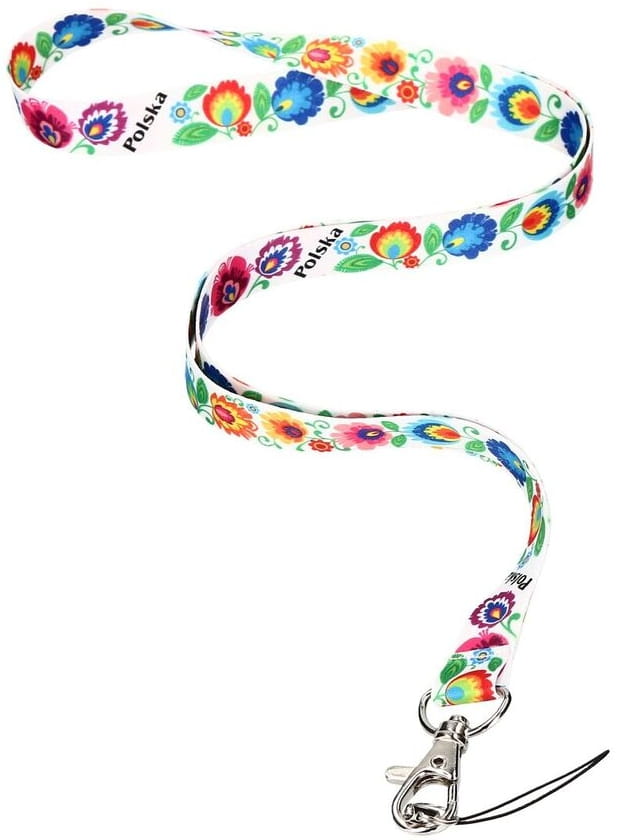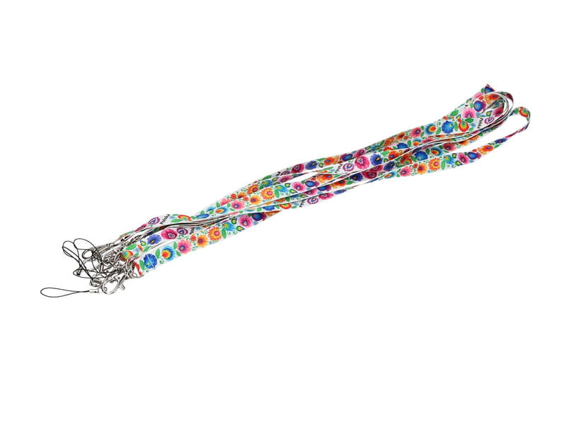Biała folkowa smycz do kluczy/telefonu ze zdobieniami stylizowanymi na ludowo. Przedstawiają wzory inspirowane łowicką wycinanką.