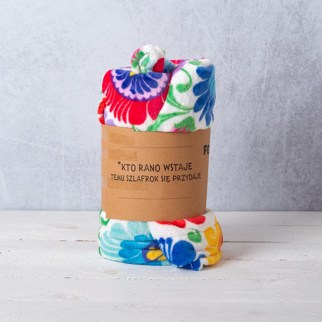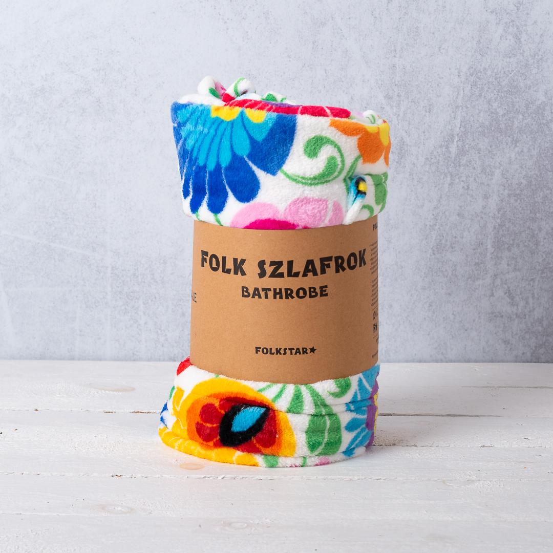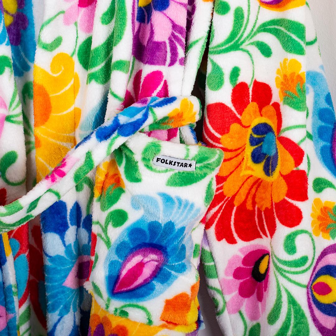 Biały folkowy szlafrok z nadrukowanym wzorem kwiatów z łowickiej wycinanki.