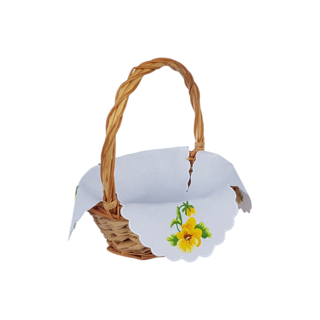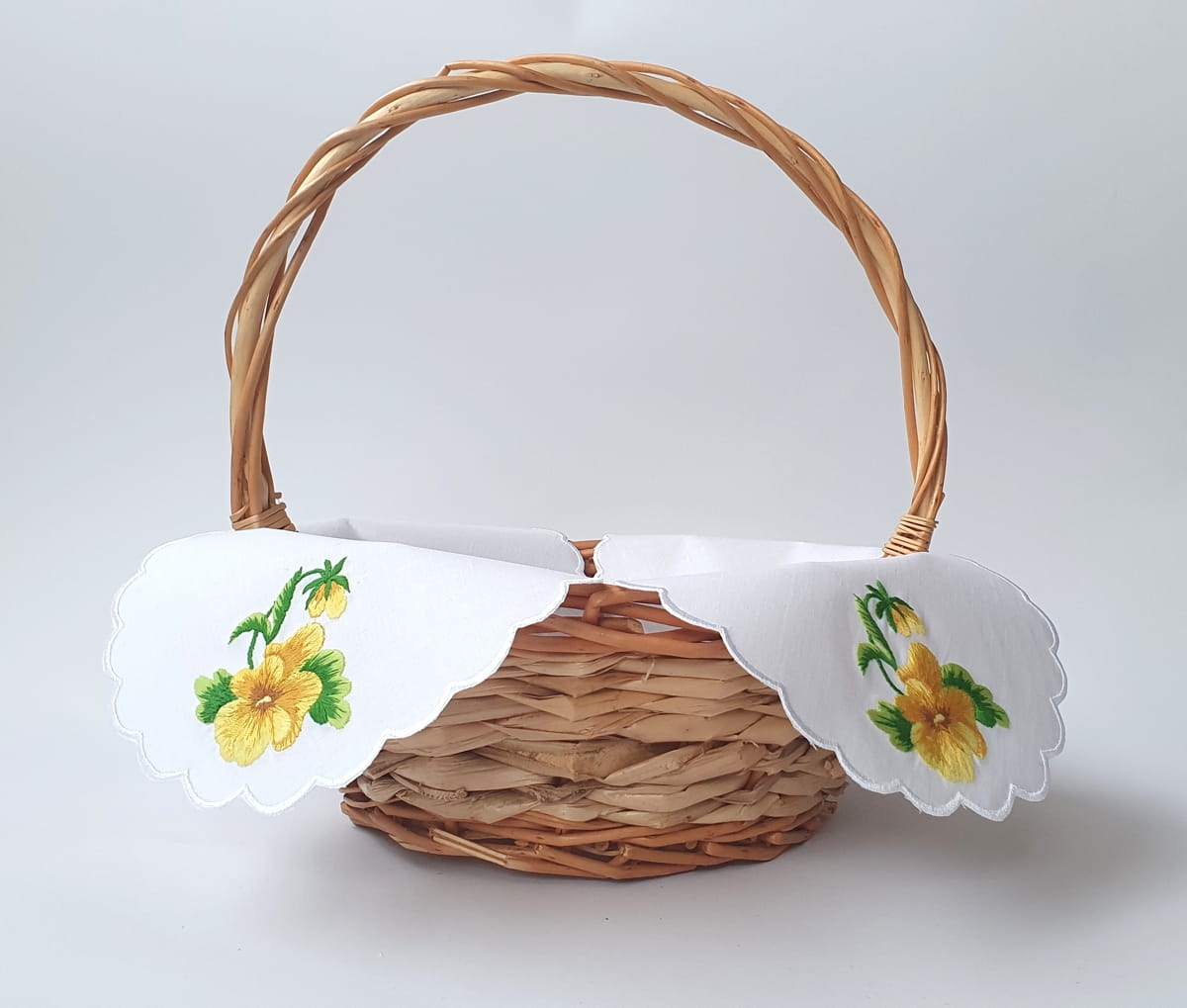 Biała serwetka do koszyczka wielkanocnego ozdobiona haftem łowickim (żółte bratki).