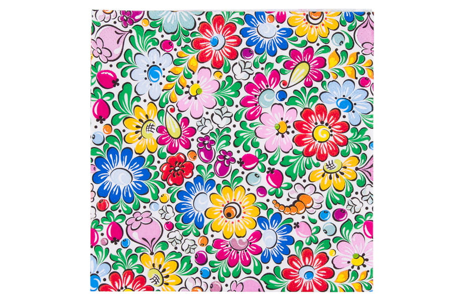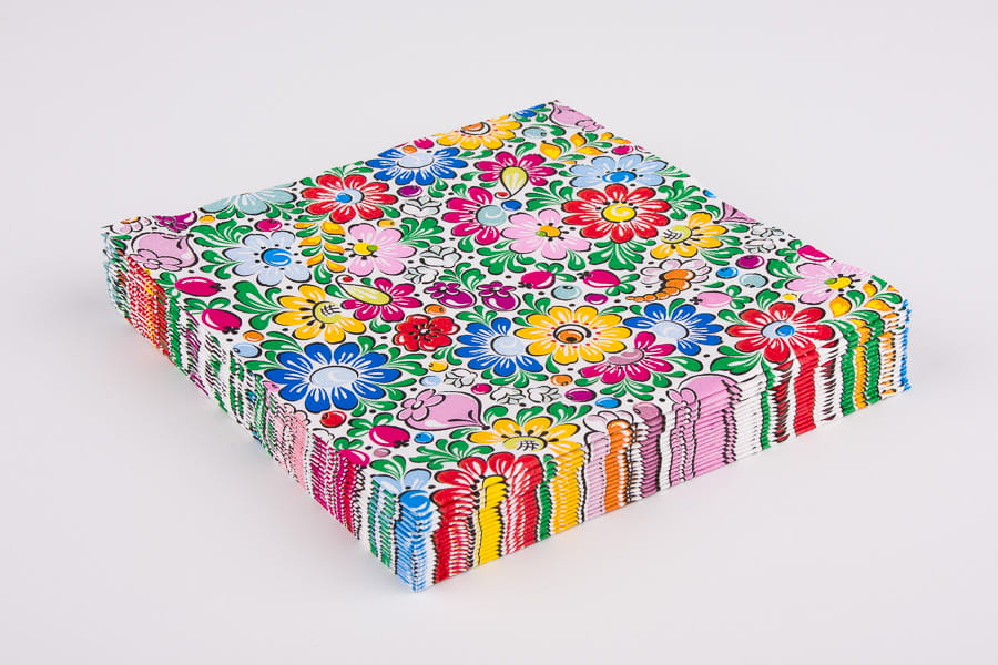 Wielokolorowe serwetki papierowe z wzorami kwiatowymi charakterystycznymi dla opolskich "kroszonek" - ręcznie malowanych pisanek wielkanocnych.