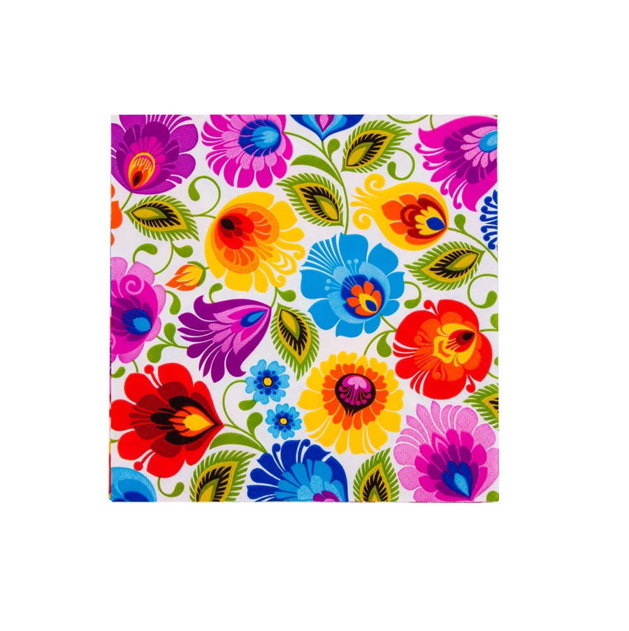 Białe folkowe serwetki papierowe ozdobione kolorowymi wzorami kwiatowymi inspirowanymi wycinanką łowicką.