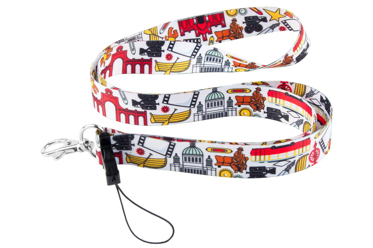 Biała szeroka smycz do telefonu/kluczy z napisem Łódź wzorami przedstawiającym symbole miasta Łodzi.