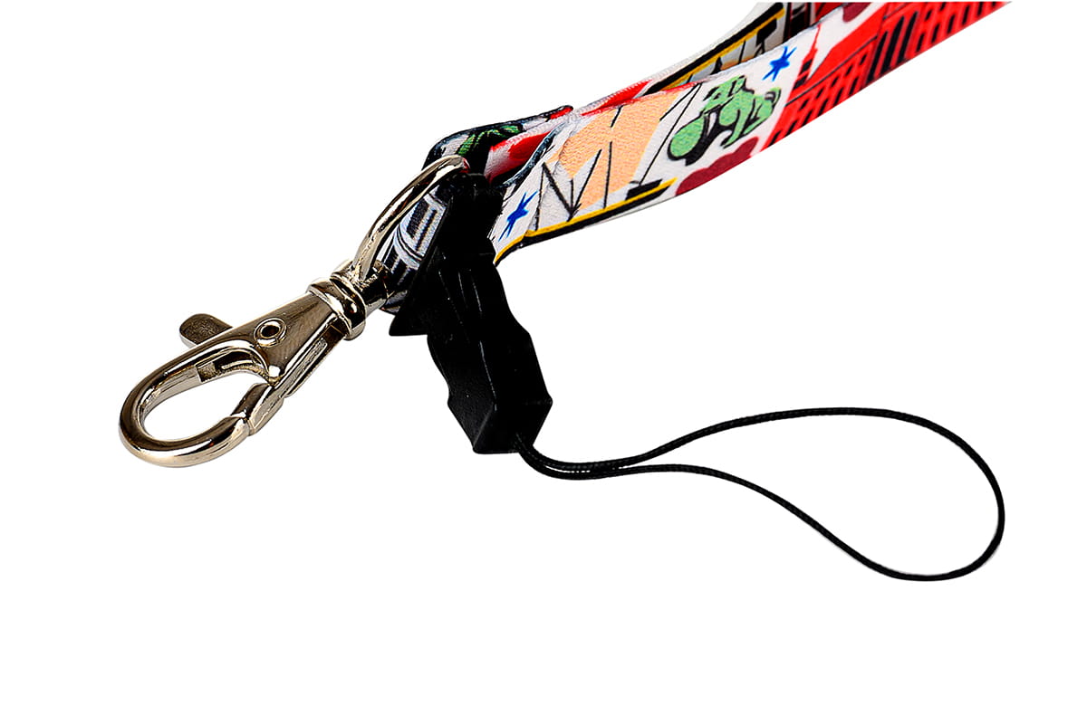 Smycz posiada zaczep do telefonu oraz metalowy karabińczyk.