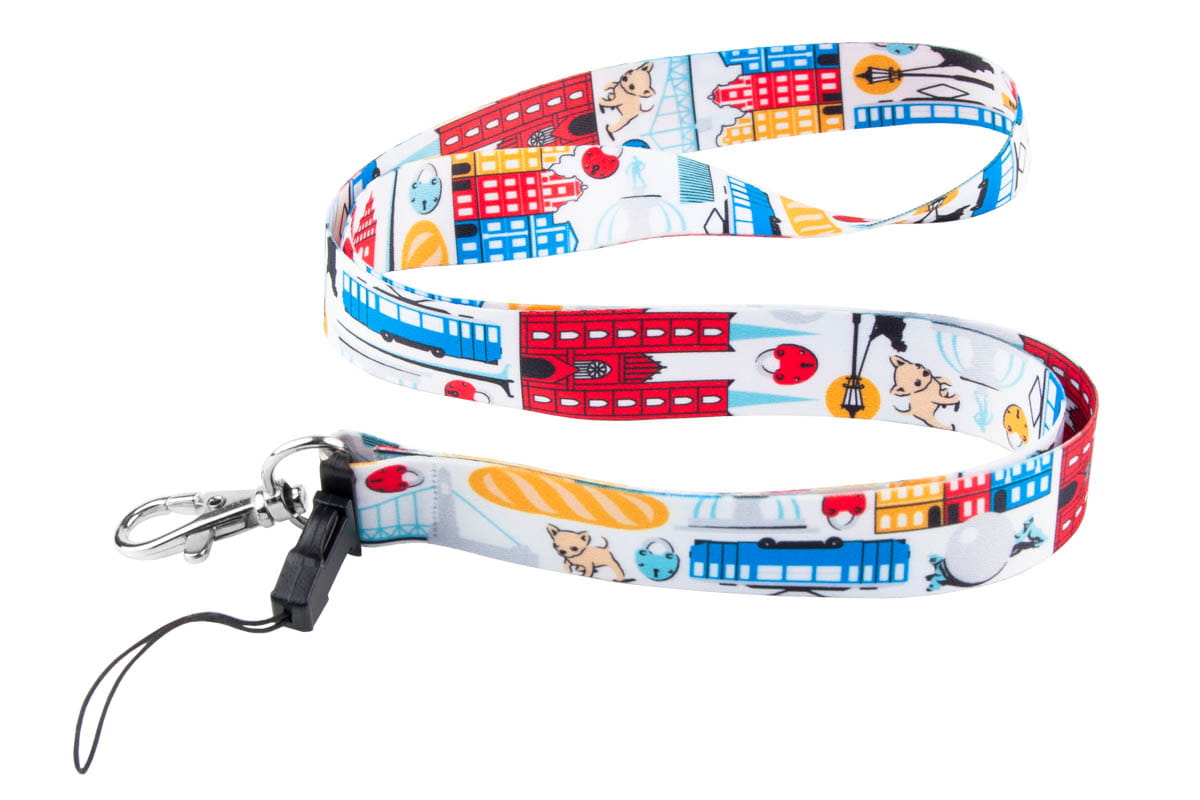 Biała szeroka smycz do telefonu/kluczy z napisem Wrocław wzorami przedstawiającym symbole miasta Wrocławia.