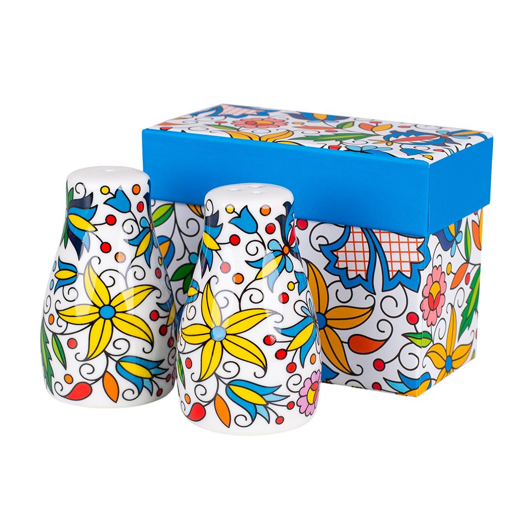 Zestaw zawiera solniczkę i pieprzniczkę ozdobione ludowym wzorem przedstawiającym kwiaty z haftów kaszubskich.
