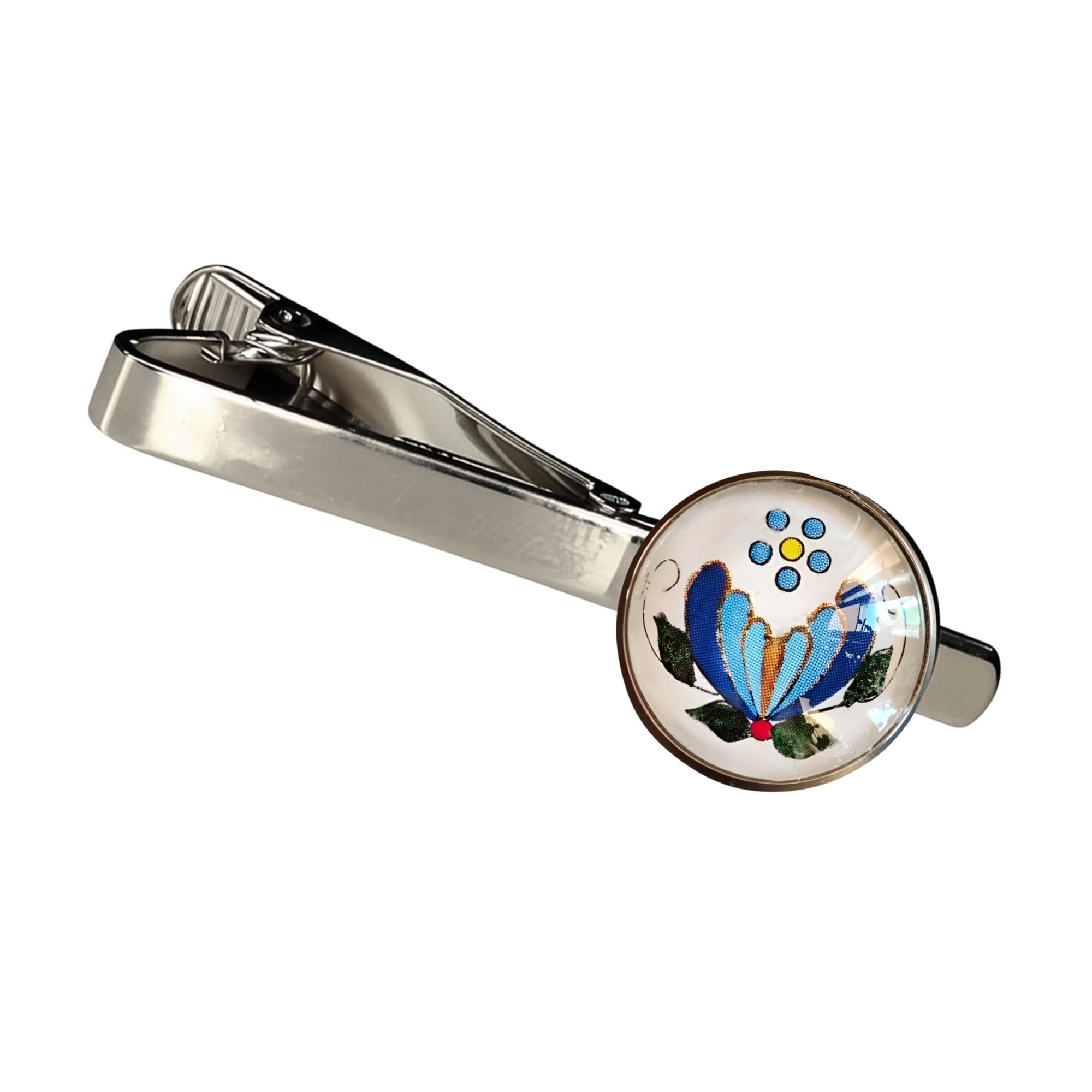 Ręcznie wykonane spinka do krawata z kaszubskim wzorem kwiatowym na białym tle.
