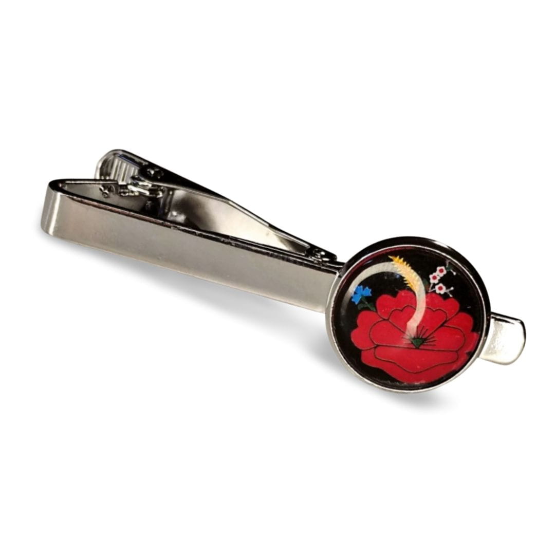 Ręcznie wykonane spinka do krawata z kociewskim wzorem kwiatowym na czarnym tle.