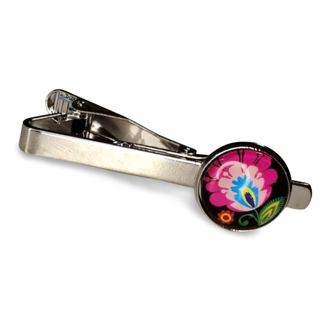 Ręcznie wykonane spinka do krawata z wzorem inspirowanym wycinanką łowicką.