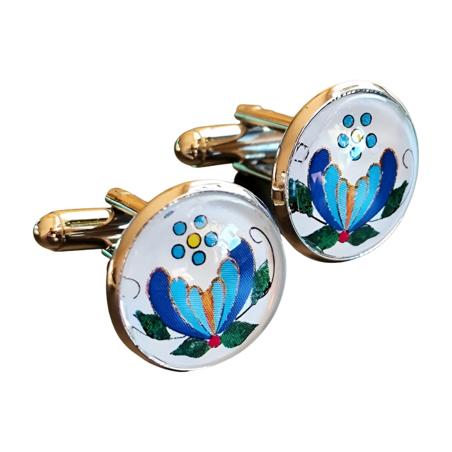 Ręcznie wykonane okrągłe spinki do mankietów z kaszubskim wzorem kwiatowym na białym tle.