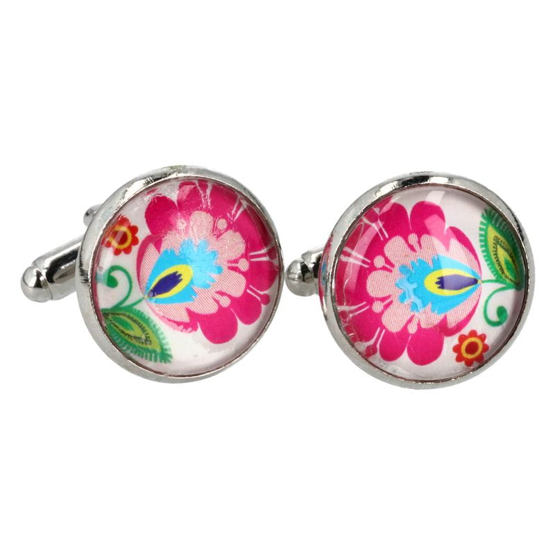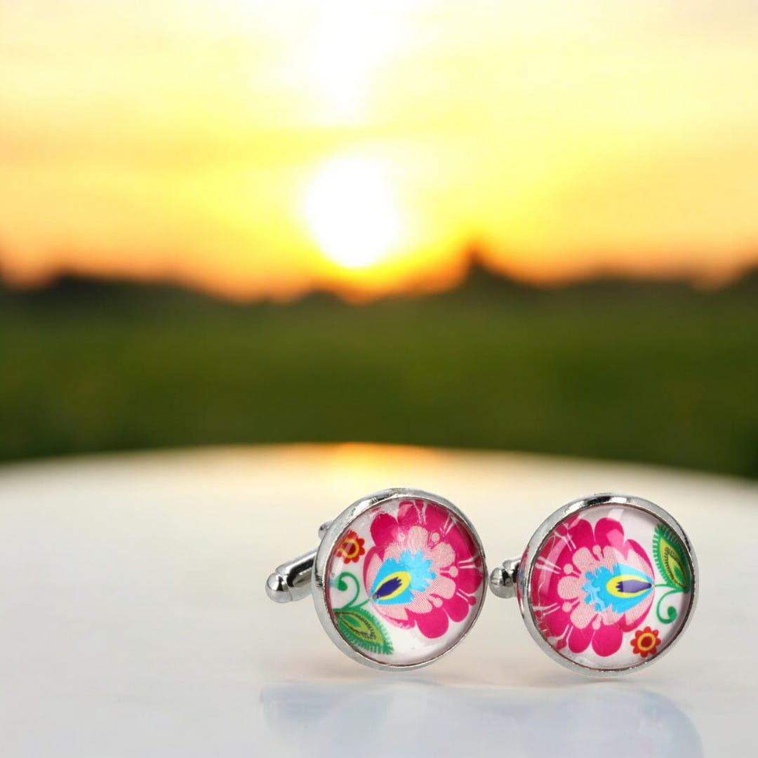 Ręcznie wykonane okrągłe spinki do mankietów z łowickim wzorem kwiatowym na białym tle.