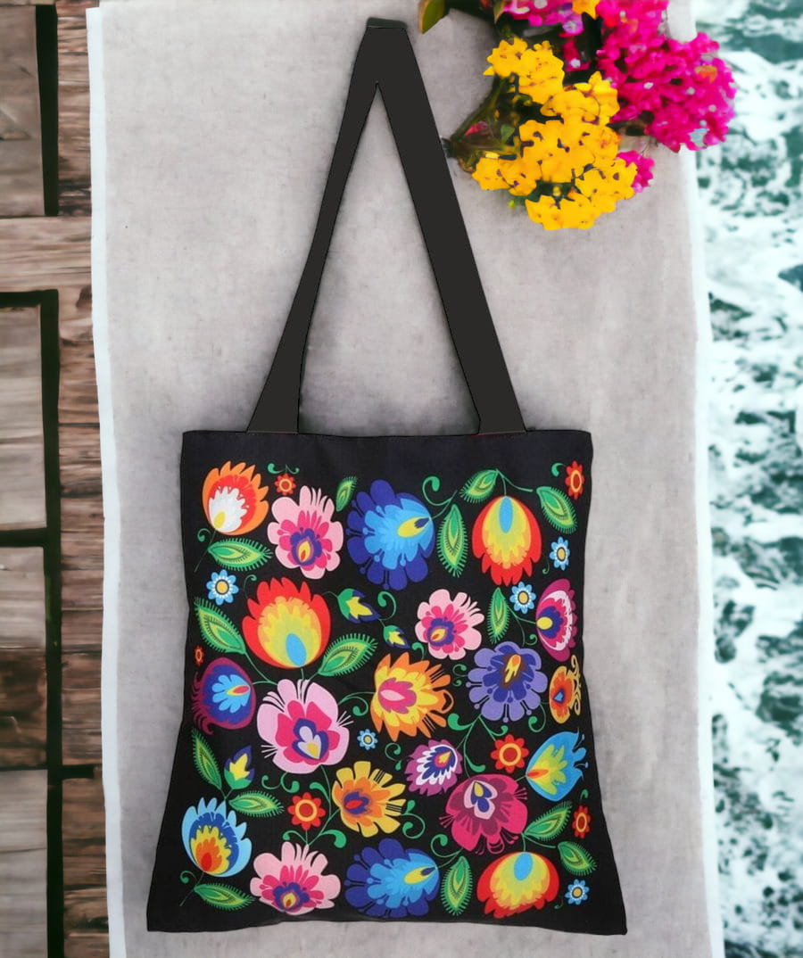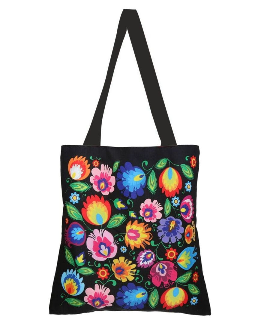 Czarna torba na zakupy z nadrukowanym kolorowym wzorem inspirowanym wycinanką łowicką.