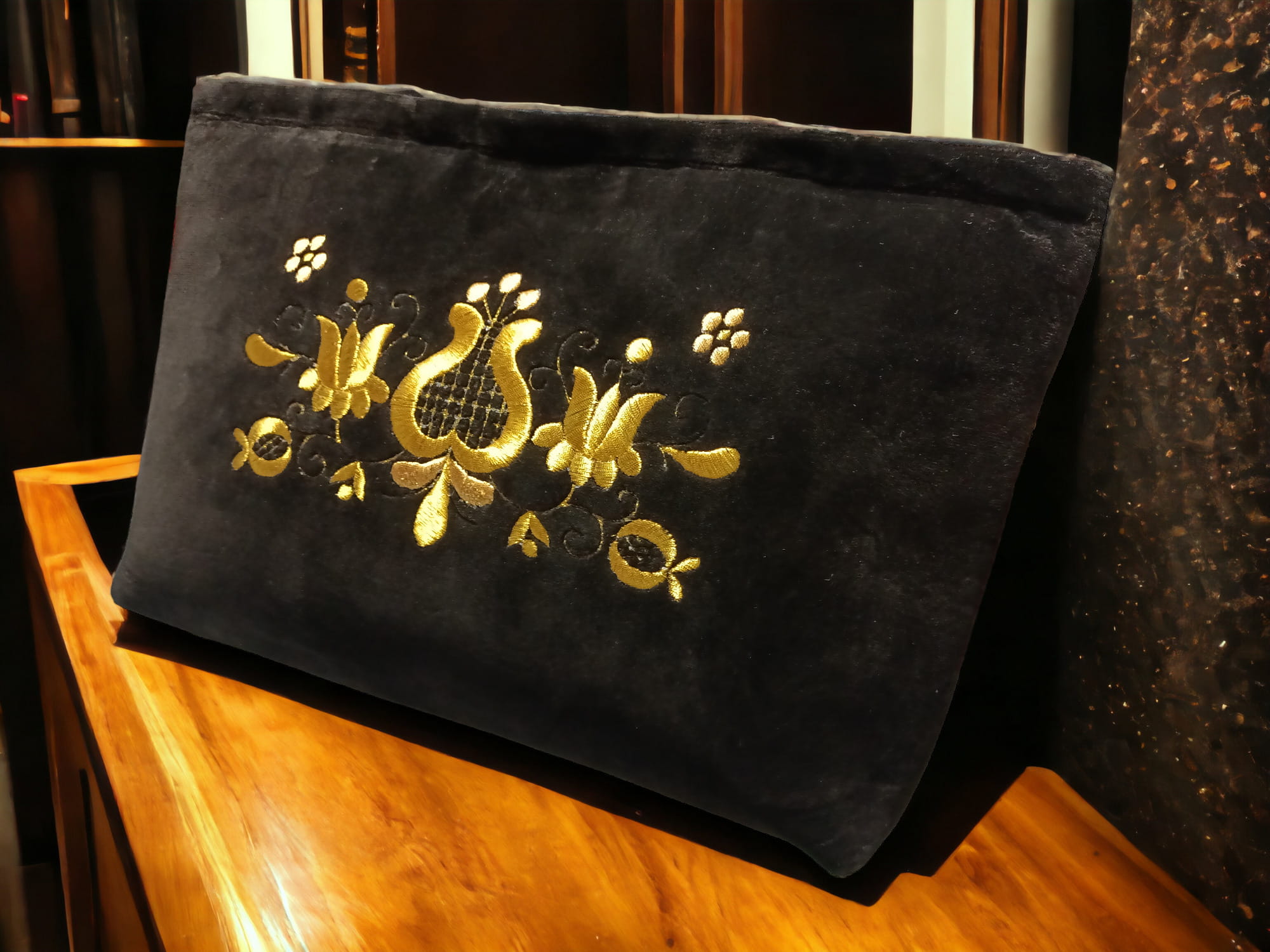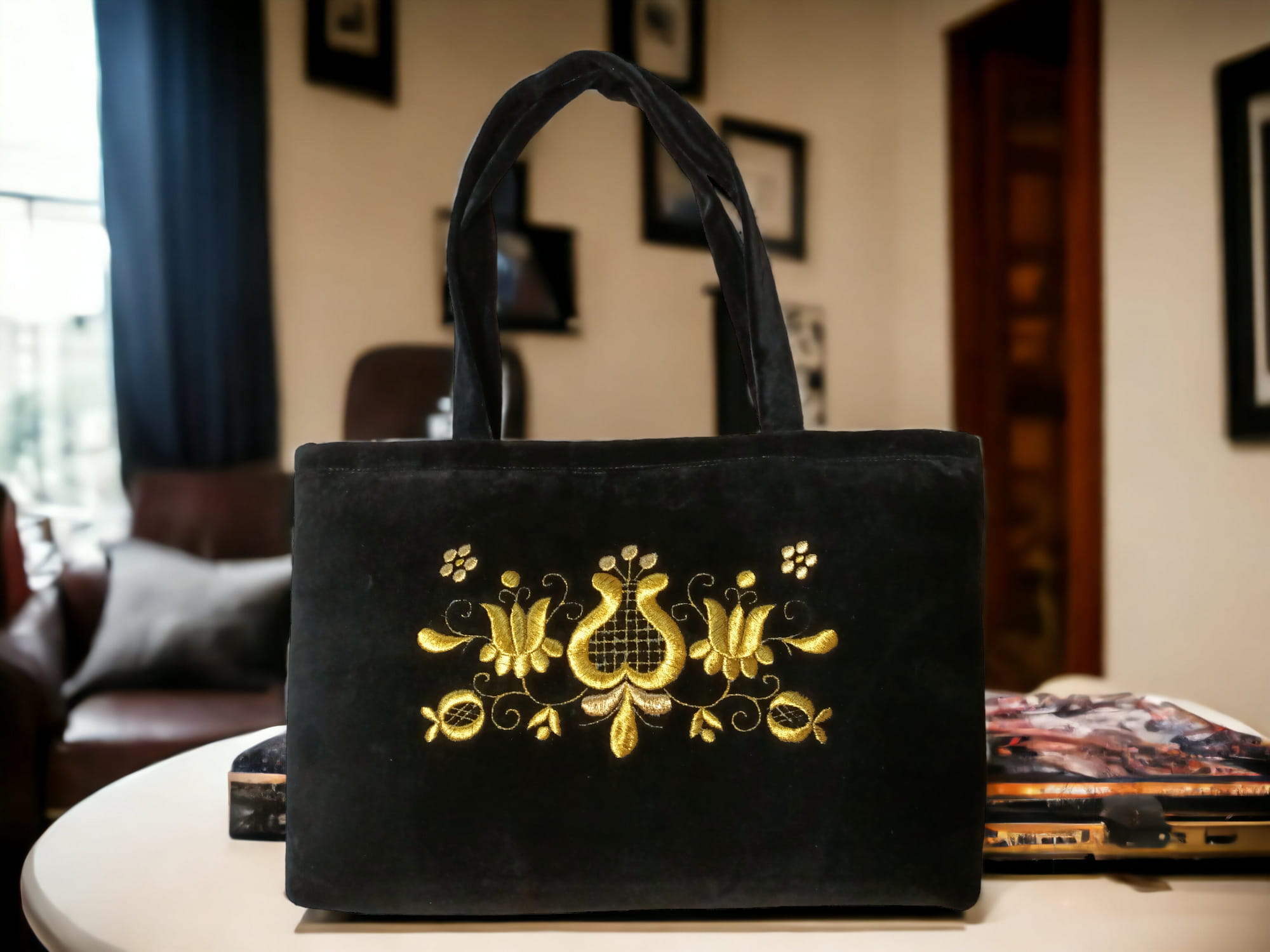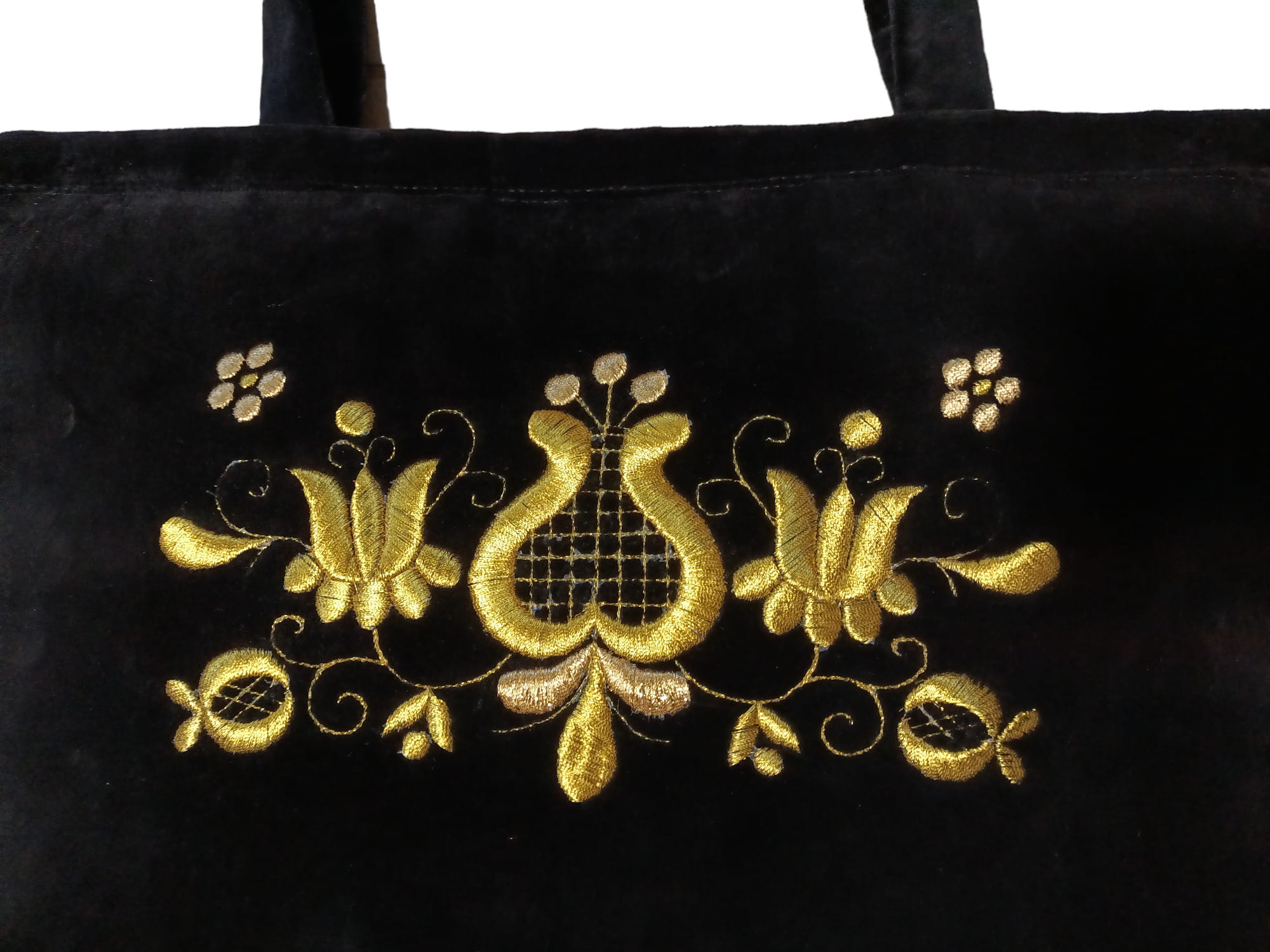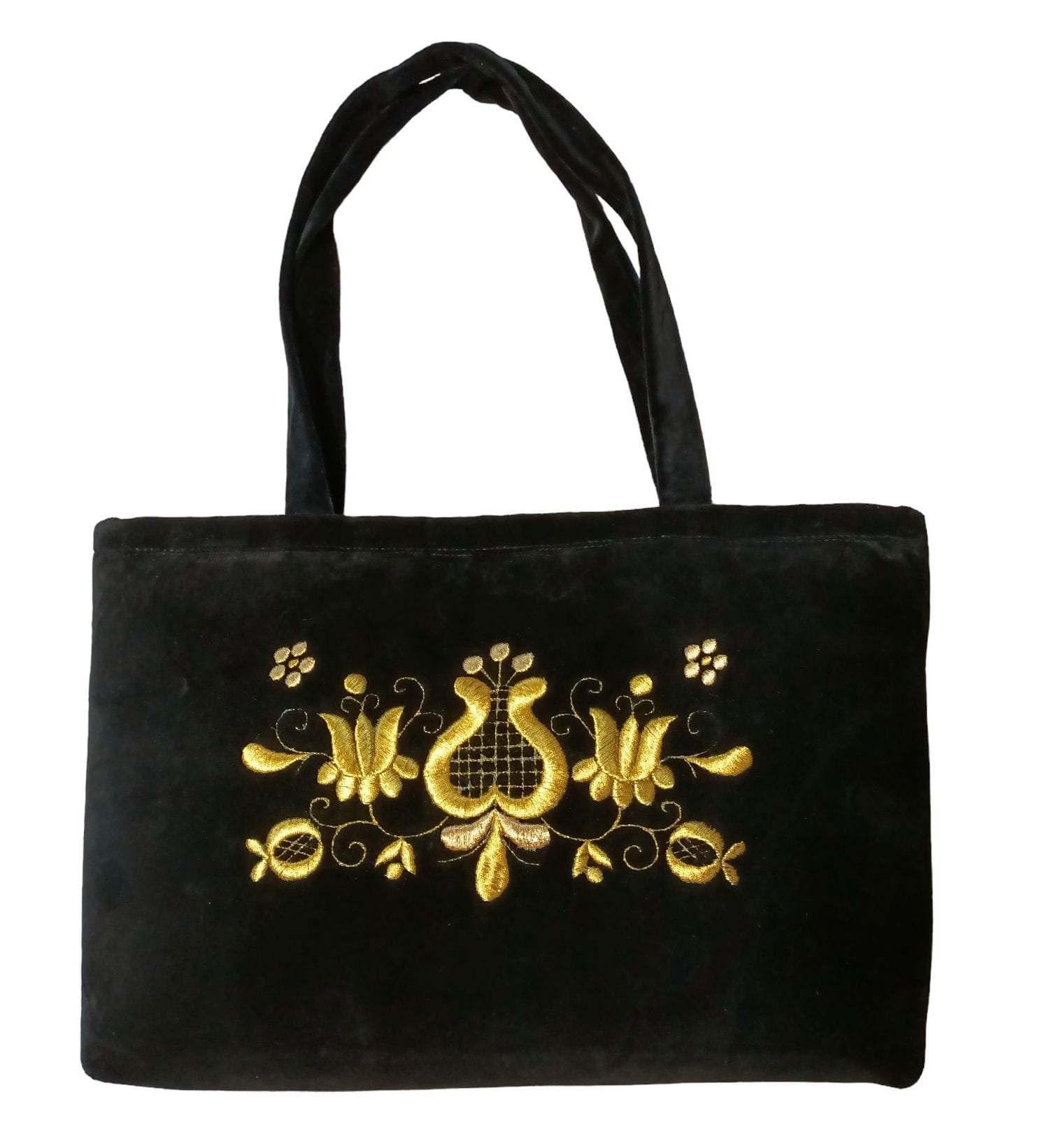 Torebka folk uszyta z czarnego aksamitu. Ozdobiona jest haftem z kaszubskim wzorem złotnicy.
