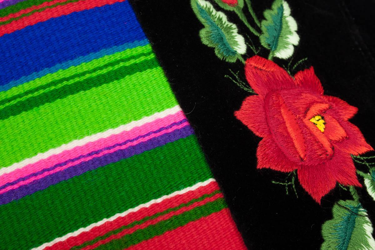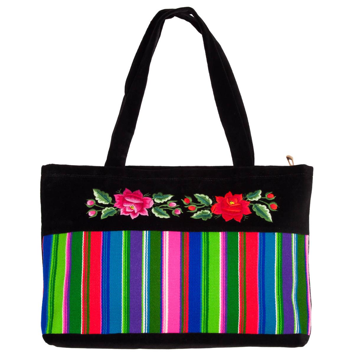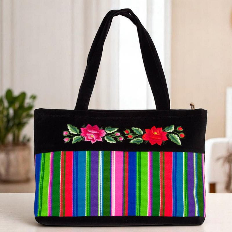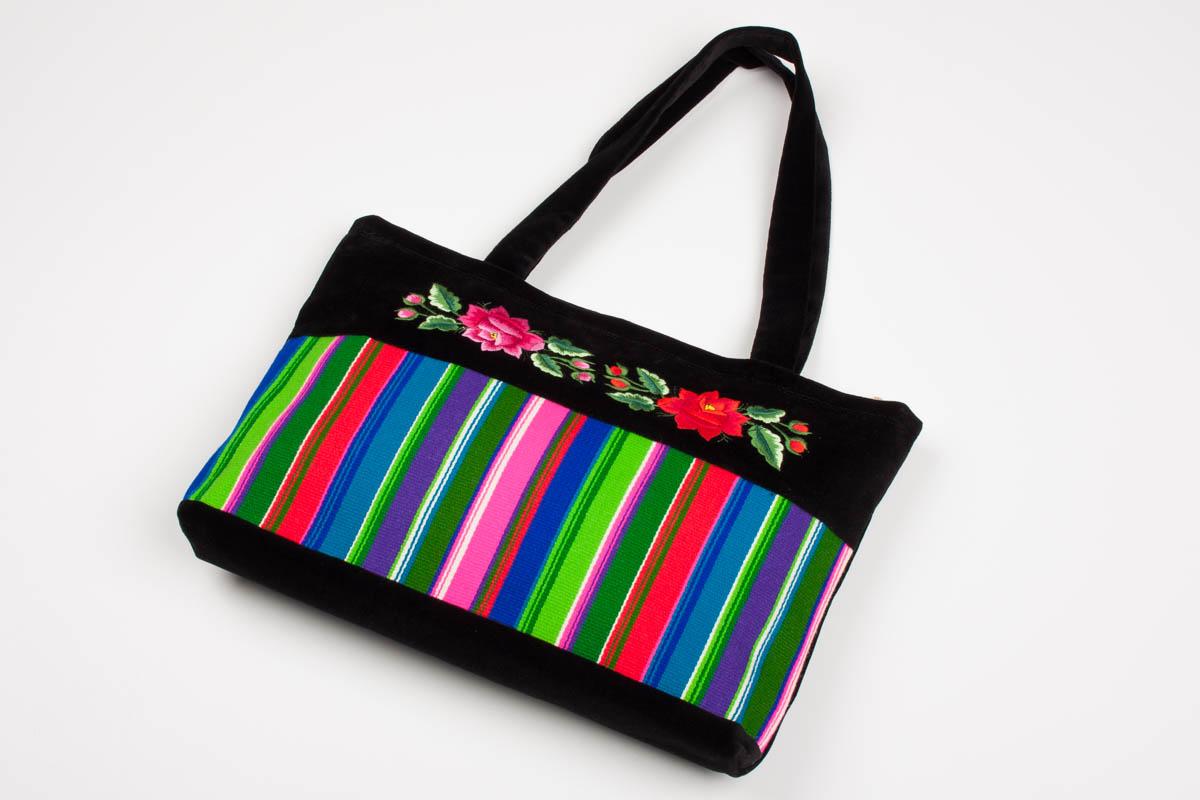 Kolorowa pojemna torba na ramię. Wykonana z tradycyjnego łowickiego pasiaka oraz czarnego aksamitu na którym znajduje się haft przedstawiający łowickie róże.