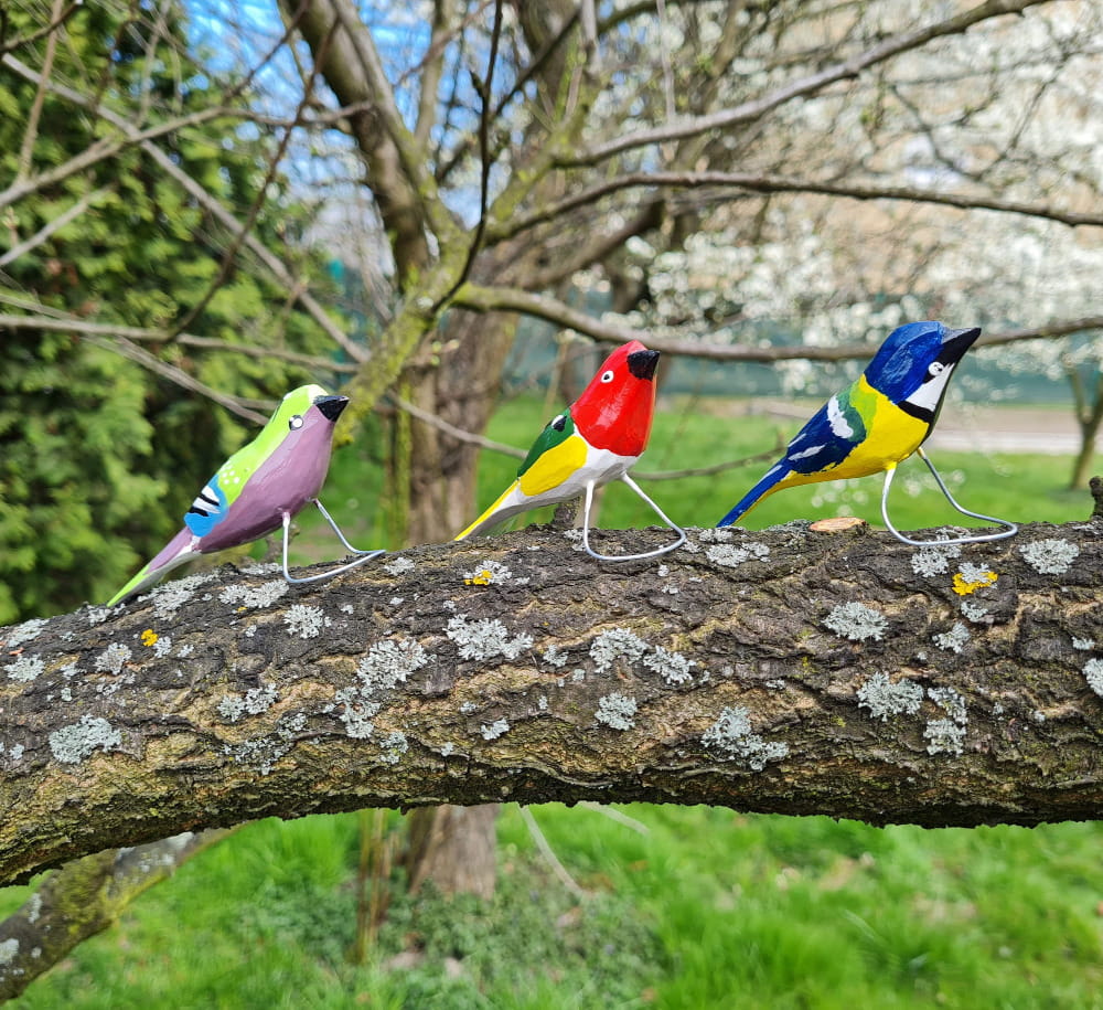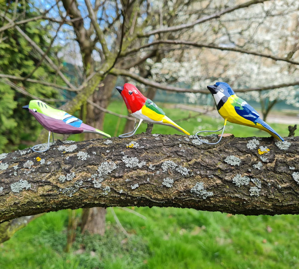 Ptaszki zostały ręcznie wykonane z drewna. Malowane farbami akrylowymi i lakierowane lakierem wodnym.