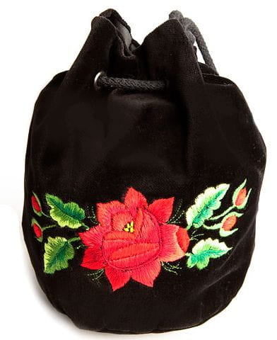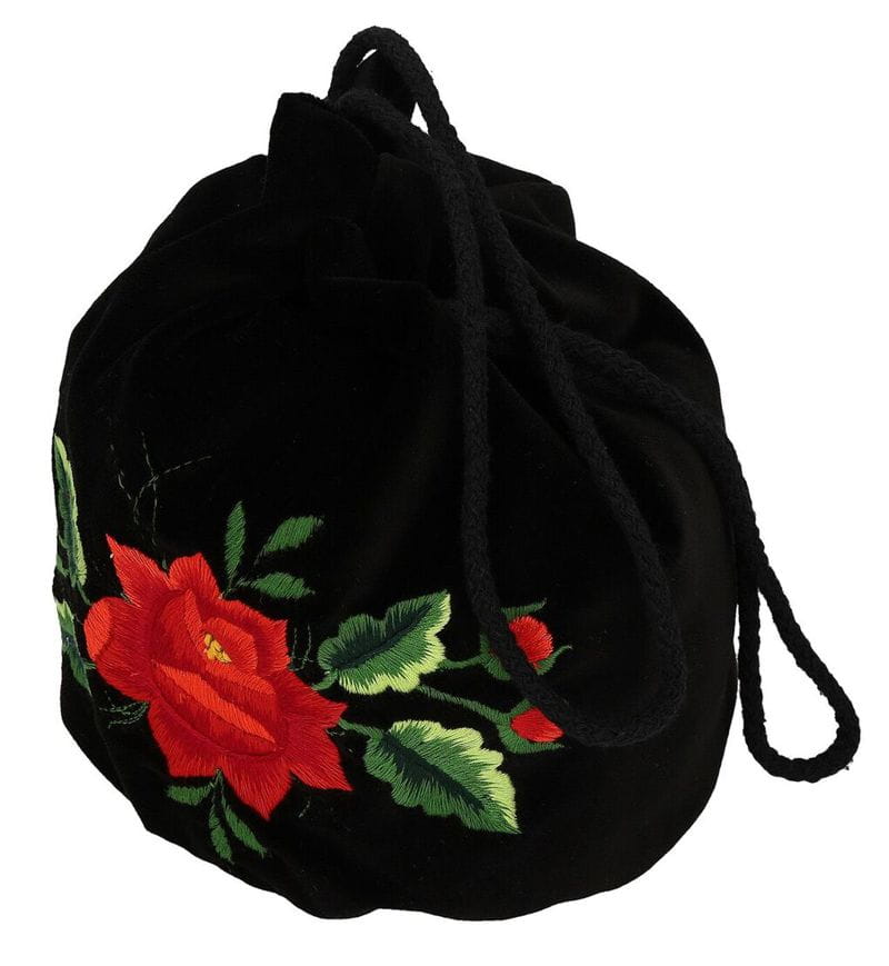 Poręczna torebka worek z haftem łowickim. Wykonana z czarnego aksamitu, na którym wyhaftowany został wzór tradycyjnej czerwonej róży łowickiej.